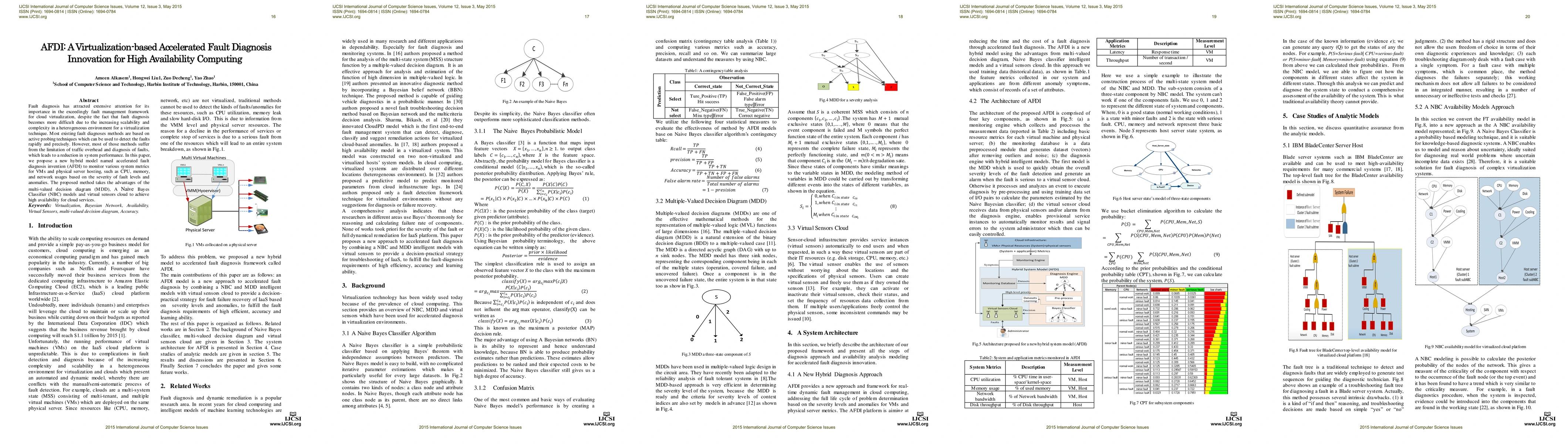 The paper proposes AFDI, a hybrid model for accelerated fault diagnosis in virtualization environments, combining multi-valued decision diagrams, Naive Bayes Classifiers, and virtual sensors to monitor system metrics and enhance high availability without significant performance overhead. AFDI aims to improve fault detection efficiency and system performance in complex, scalable cloud environments.