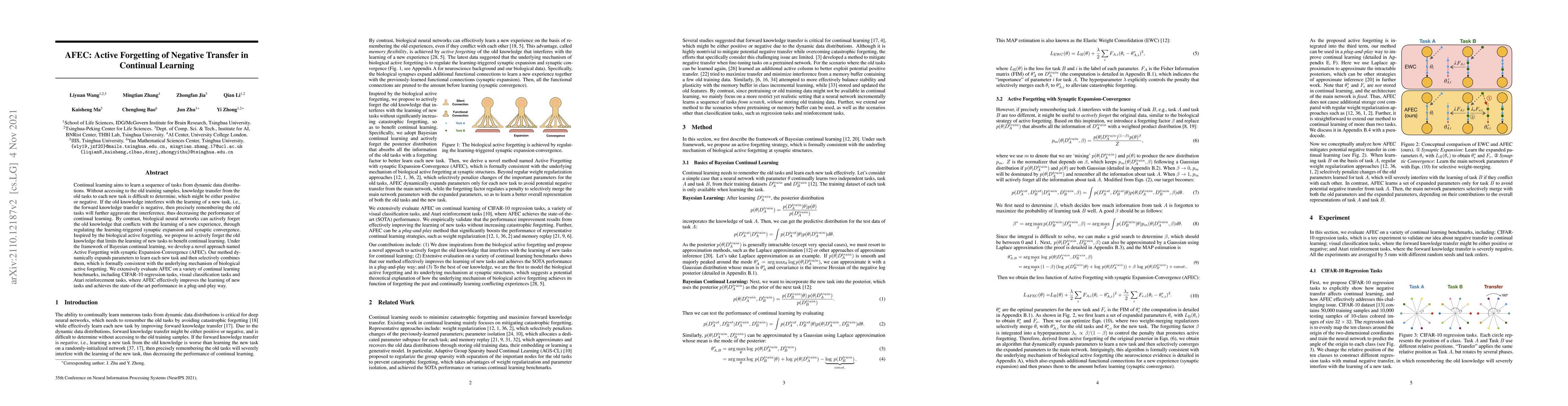 The paper proposes AFEC, a novel continual learning approach that actively forgets old knowledge interfering with the learning of new tasks, inspired by biological active forgetting mechanisms. AFEC dynamically expands and converges parameters to optimize performance across tasks, achieving state-of-the-art results on various benchmarks.