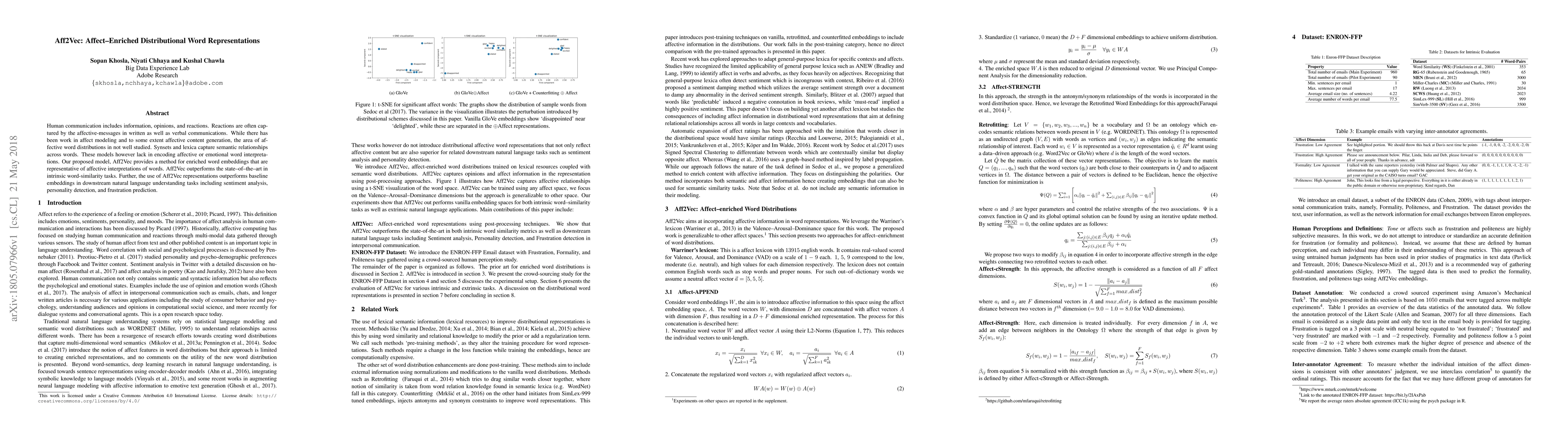 Aff2Vec introduces enriched word embeddings that capture affective interpretations, outperforming existing models in word-similarity tasks and improving performance in sentiment analysis, personality detection, and frustration prediction. This approach addresses the gap in affective word distribution modeling.