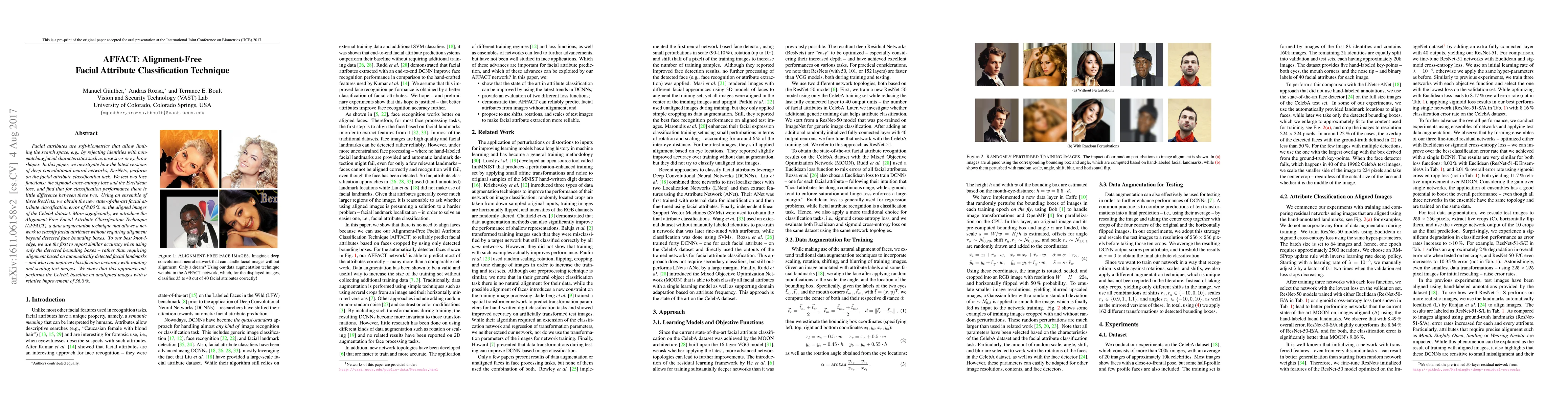 The AFFACT technique leverages ensemble ResNets to achieve state-of-the-art facial attribute classification with an error rate of 8.00% on aligned CelebA images, and introduces a novel data augmentation method that allows accurate classification without requiring face alignment beyond bounding boxes.