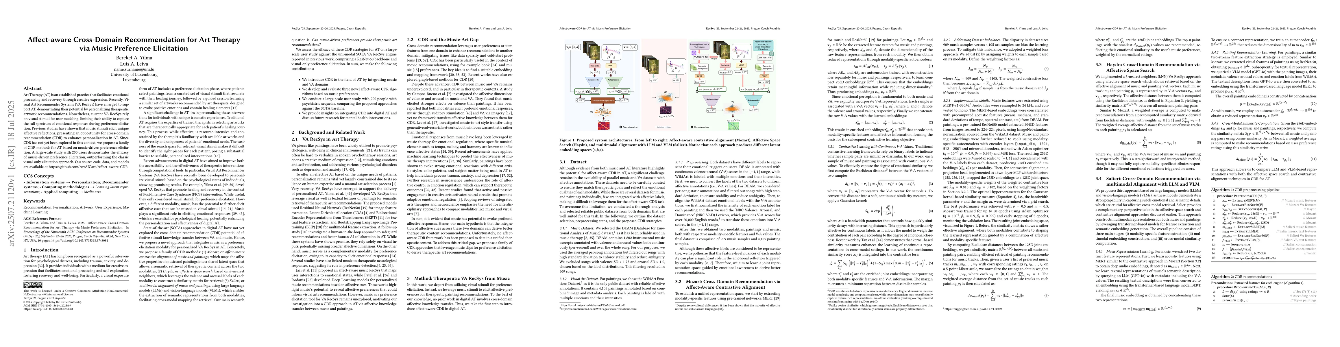 Art Therapy (AT) is an established practice that facilitates emotional processing and recovery through creative expression. Recently, Visual Art Recommender Systems (VA RecSys) have emerged to support AT, demonstrating their potential by personalizing therapeutic artwork recommendations. Nonetheless, current VA RecSys rely on visual stimuli for user modeling, limiting their ability to capture the full spectrum of emotional responses during preference elicitation. Previous studies have shown that music stimuli elicit unique affective reflections, presenting an opportunity for cross-domain recommendation (CDR) to enhance personalization in AT. Since CDR has not yet been explored in this context, we propose a family of CDR methods for AT based on music-driven preference elicitation. A large-scale study with 200 users demonstrates the efficacy of music-driven preference elicitation, outperforming the classic visual-only elicitation approach. Our source code, data, and models are available at https://github.com/ArtAICare/Affect-aware-CDR