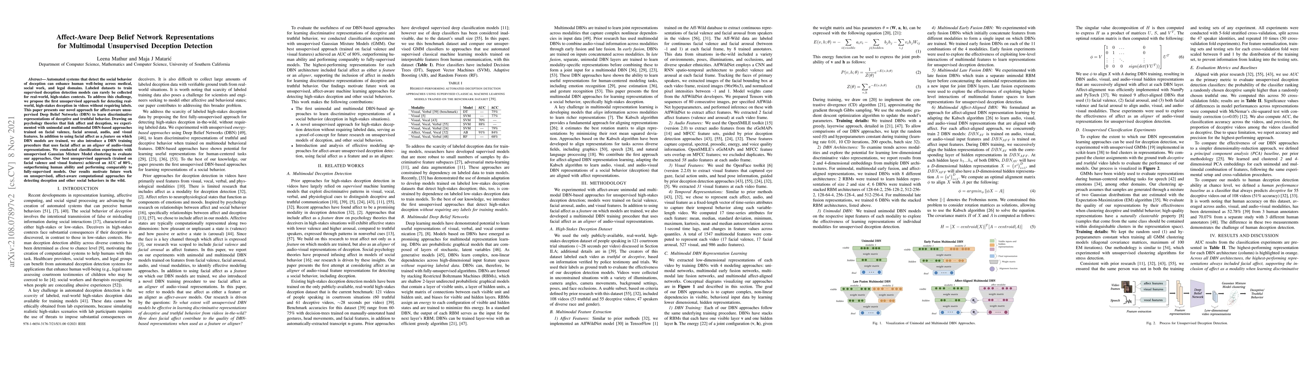This paper proposes an unsupervised Deep Belief Network (DBN) approach for detecting deception in videos without labeled data, leveraging facial affect and multimodal features. The best performing model, trained on facial valence and visual features, achieved an AUC of 80%, outperforming human detection and rivaling supervised models.