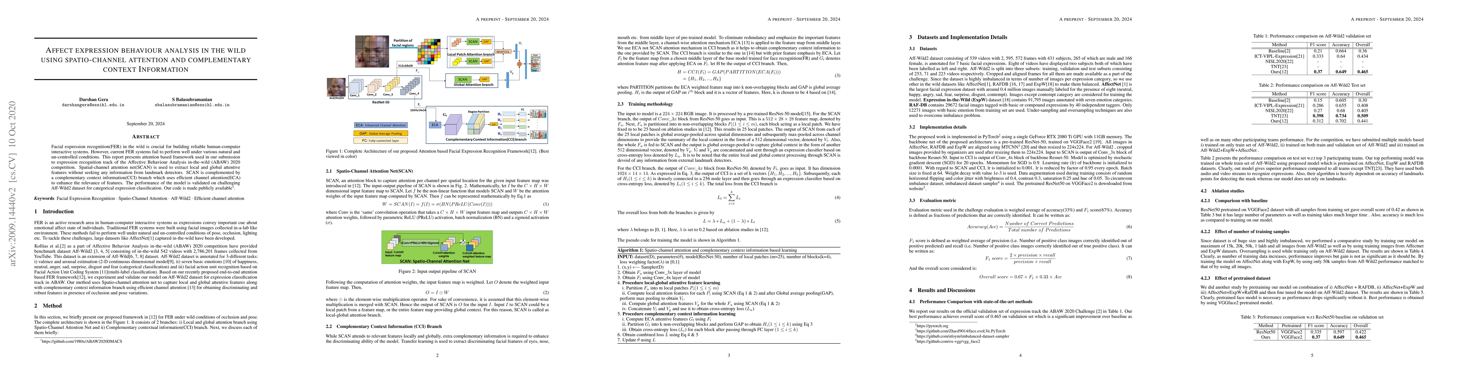Facial expression recognition(FER) in the wild is crucial for building reliable human-computer interactive systems. However, current FER systems fail to perform well under various natural and un-controlled conditions. This report presents attention based framework used in our submission to expression recognition track of the Affective Behaviour Analysis in-the-wild (ABAW) 2020 competition. Spatial-channel attention net(SCAN) is used to extract local and global attentive features without seeking any information from landmark detectors. SCAN is complemented by a complementary context information(CCI) branch which uses efficient channel attention(ECA) to enhance the relevance of features. The performance of the model is validated on challenging Aff-Wild2 dataset for categorical expression classification.
