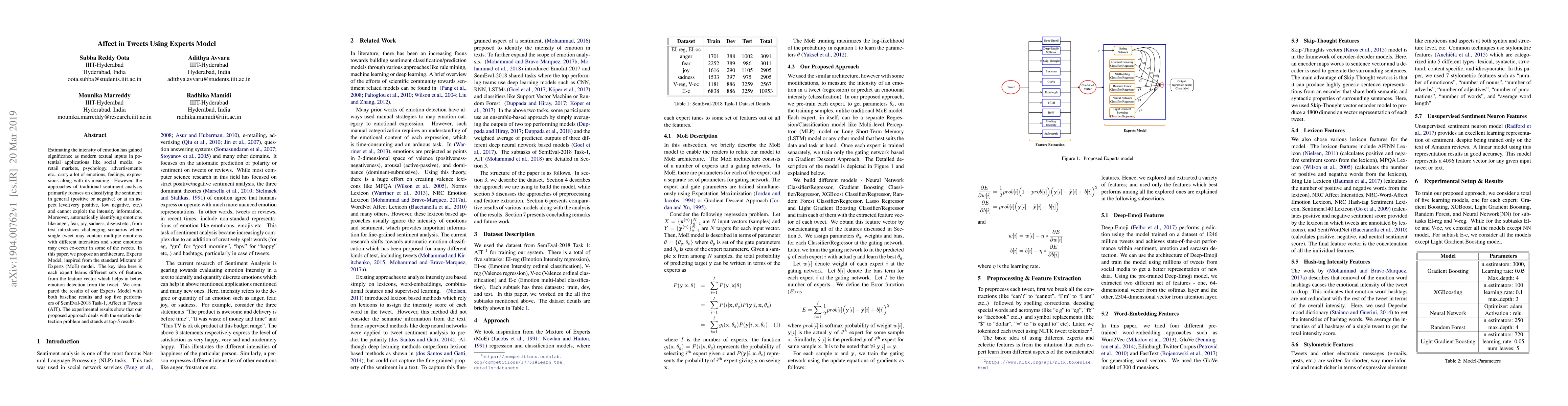 Estimating the intensity of emotion has gained significance as modern textual inputs in potential applications like social media, e-retail markets, psychology, advertisements etc., carry a lot of emotions, feelings, expressions along with its meaning. However, the approaches of traditional sentiment analysis primarily focuses on classifying the sentiment in general (positive or negative) or at an aspect level(very positive, low negative, etc.) and cannot exploit the intensity information. Moreover, automatically identifying emotions like anger, fear, joy, sadness, disgust etc., from text introduces challenging scenarios where single tweet may contain multiple emotions with different intensities and some emotions may even co-occur in some of the tweets. In this paper, we propose an architecture, Experts Model, inspired from the standard Mixture of Experts (MoE) model. The key idea here is each expert learns different sets of features from the feature vector which helps in better emotion detection from the tweet. We compared the results of our Experts Model with both baseline results and top five performers of SemEval-2018 Task-1, Affect in Tweets (AIT). The experimental results show that our proposed approach deals with the emotion detection problem and stands at top-5 results.