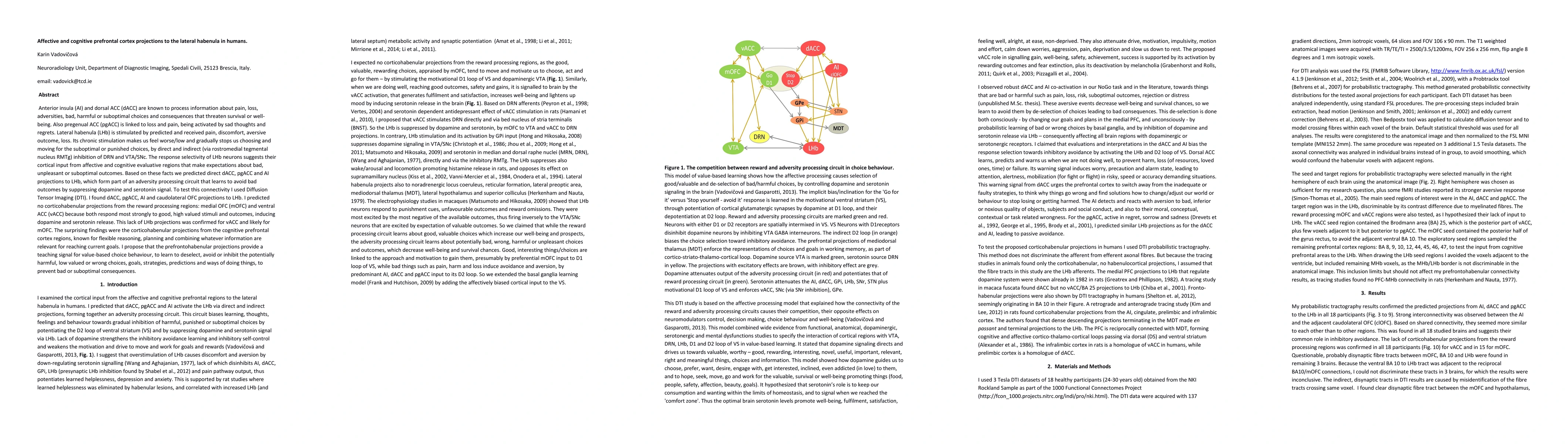 Anterior insula (AI) and dACC are known to process information about pain, loss, adversities, bad, harmful or suboptimal choices and consequences that threaten survival or well-being. Pain and loss activate also pregenual ACC (pgACC), linked to sad thoughts, hurt and regrets. The lateral habenula (LHb) is stimulated by predicted and received pain, discomfort, aversive outcome, loss. Its chronic stimulation makes us feel worse/low and gradually stops us choosing and moving for suboptimal, hurtful or punished choices, by direct and indirect (via RMTg) inhibition of DRN and VTA/SNc. Response selectivity of LHb neurons suggests their cortical input from affective and cognitive evaluative regions that make expectations about bad or suboptimal outcomes. Based on these facts I predicted direct corticohabenular projections from the dACC, pgACC and AI, as part of the adversity processing circuit that learns to avoid bad outcomes by suppressing dopamine and serotonin signal. Using DTI I found dACC, pgACC, AI, adjacent caudolateral and lateral OFC projections to LHb. I predicted no corticohabenular projections from the reward processing regions: medial OFC and vACC because both respond most strongly to good, high value stimuli and outcomes, inducing serotonin and dopamine release respectively. This lack of LHb projections was confirmed for vACC and likely for mOFC. The surprising findings were the corticohabenular projections from the cognitive prefrontal cortex regions, known for flexible reasoning, planning and combining whatever information are relevant for reaching current goals. I propose that prefrontohabenular projections provide a teaching signal for value-based choice behaviour, to learn to deselect, avoid or inhibit the potentially harmful, low valued or wrong choices, goals, strategies, predictions, models and ways of doing things, to prevent bad or suboptimal consequences.