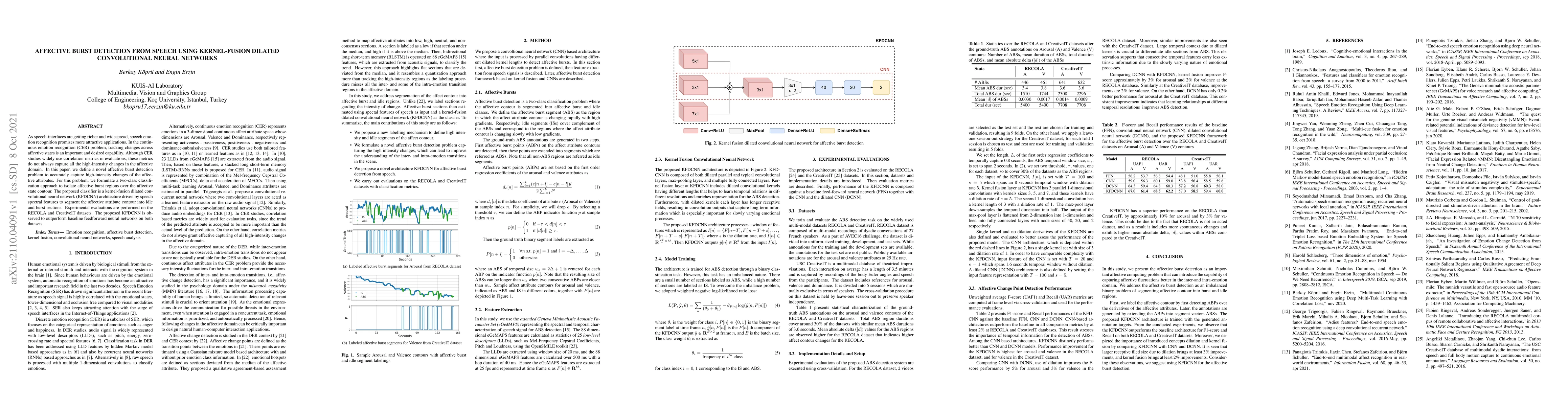 This paper introduces a novel affective burst detection problem to capture high-intensity changes in speech emotion. It proposes a kernel-fusion dilated convolutional neural network (KFDCNN) to segment affective states, outperforming baseline neural networks on RECOLA and CreativeIT datasets.