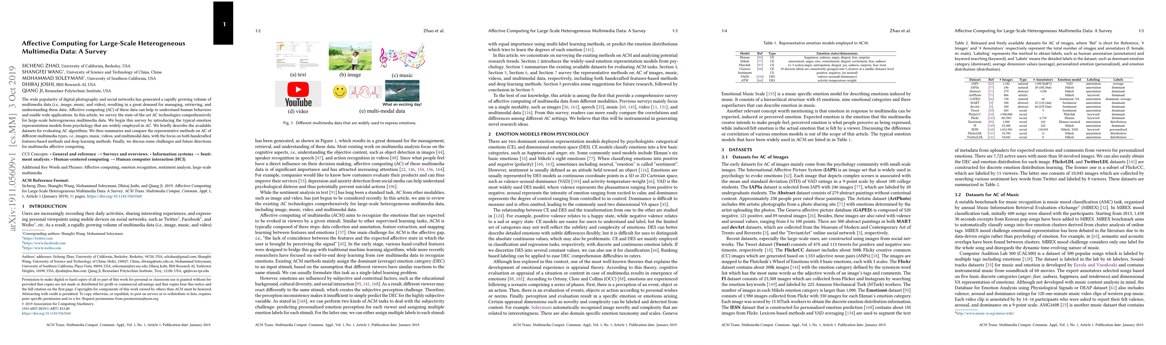 This paper surveys state-of-the-art affective computing technologies for managing large-scale heterogeneous multimedia data, including images, music, and videos. It discusses emotion representation models, datasets, and compares methods based on handcrafted features and deep learning, while highlighting challenges and future directions.