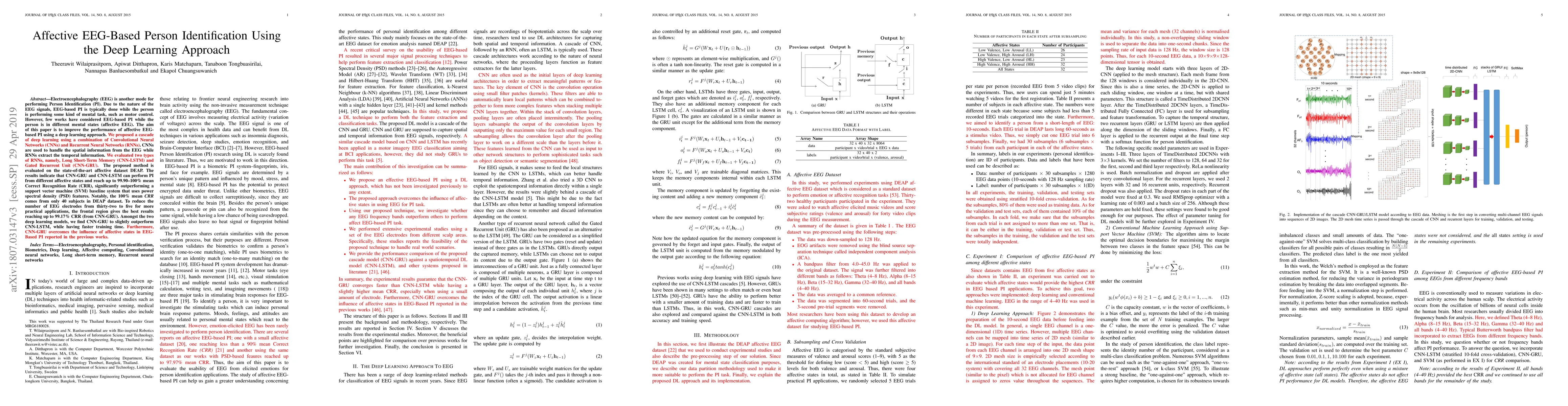 This paper proposes a deep learning approach for affective EEG-based person identification using CNNs and RNNs, achieving up to 100% mean Correct Recognition Rate (CRR) on the DEAP dataset. CNN-GRU slightly outperforms CNN-LSTM with faster training time, and reduces the number of electrodes to five while maintaining high accuracy.