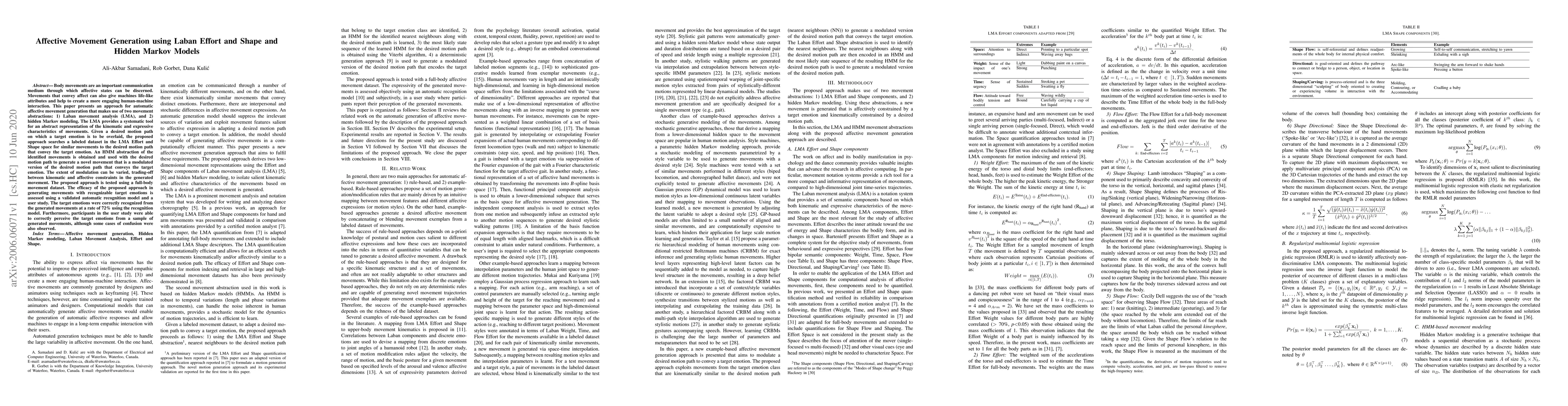 This paper proposes an automatic affective movement generation method using Laban movement analysis and hidden Markov models to create life-like emotional expressions in human-machine interactions. The approach successfully generates movements conveying target emotions, with 72% recognition accuracy by a model and positive perception from users.