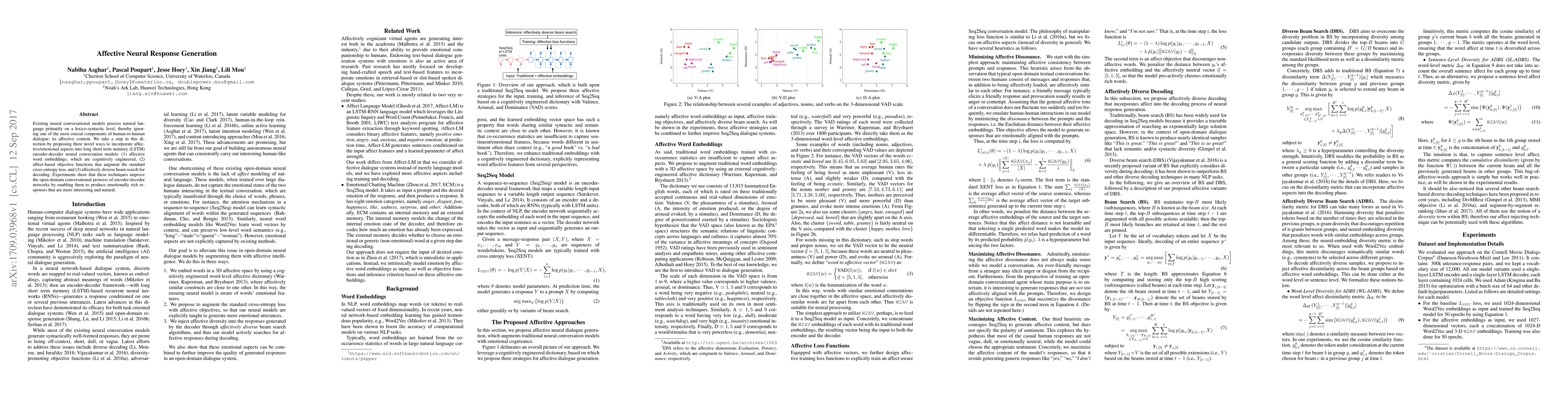 This paper proposes three novel methods to integrate affective content into LSTM encoder-decoder neural conversation models, including affective word embeddings, affect-based objective functions, and affectively diverse beam search. These techniques enhance the model's ability to generate emotionally rich and natural conversational responses.