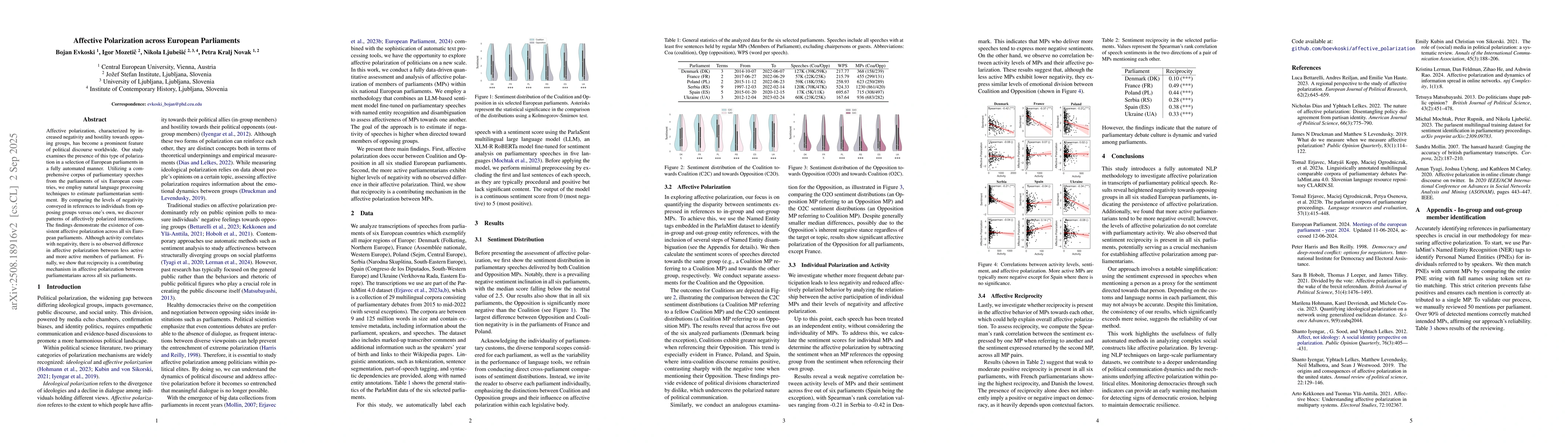 Affective polarization, characterized by increased negativity and hostility towards opposing groups, has become a prominent feature of political discourse worldwide. Our study examines the presence of this type of polarization in a selection of European parliaments in a fully automated manner. Utilizing a comprehensive corpus of parliamentary speeches from the parliaments of six European countries, we employ natural language processing techniques to estimate parliamentarian sentiment. By comparing the levels of negativity conveyed in references to individuals from opposing groups versus one's own, we discover patterns of affectively polarized interactions. The findings demonstrate the existence of consistent affective polarization across all six European parliaments. Although activity correlates with negativity, there is no observed difference in affective polarization between less active and more active members of parliament. Finally, we show that reciprocity is a contributing mechanism in affective polarization between parliamentarians across all six parliaments.