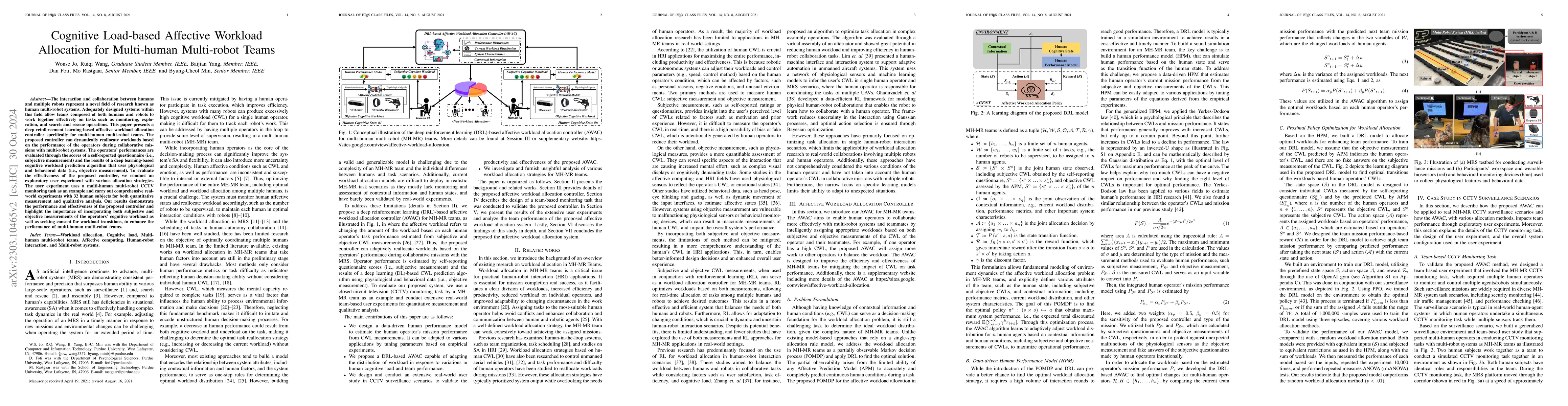 This paper proposes a deep reinforcement learning-based affective workload allocation controller for multi-human multi-robot teams, dynamically adjusting workloads based on both subjective and objective performance metrics. Experiments with 32 human subjects in a CCTV monitoring task show the controller's effectiveness in enhancing team performance.