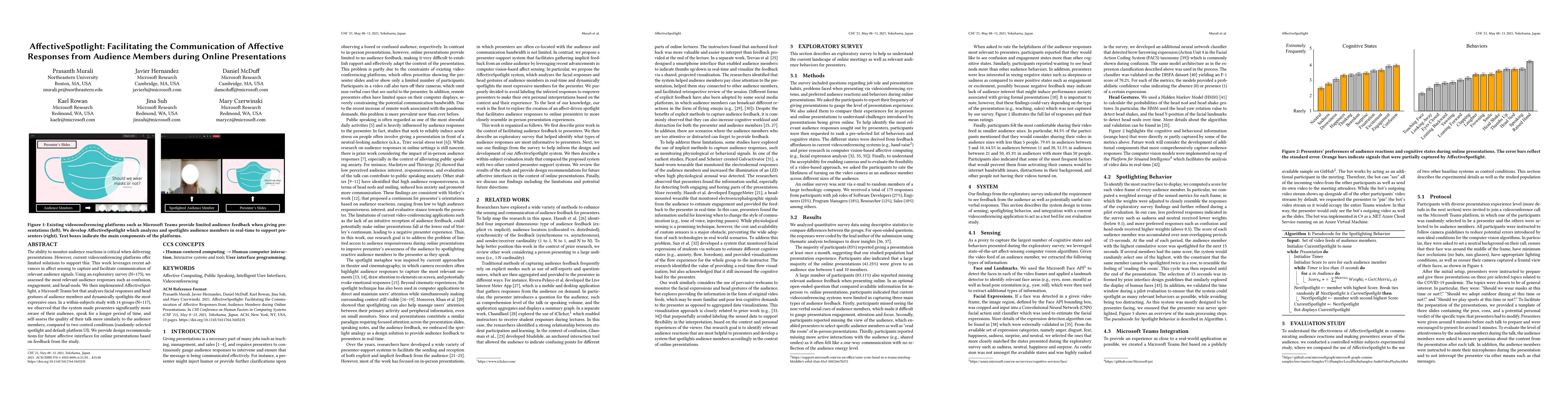 The ability to monitor audience reactions is critical when delivering presentations. However, current videoconferencing platforms offer limited solutions to support this. This work leverages recent advances in affect sensing to capture and facilitate communication of relevant audience signals. Using an exploratory survey (N = 175), we assessed the most relevant audience responses such as confusion, engagement, and head-nods. We then implemented AffectiveSpotlight, a Microsoft Teams bot that analyzes facial responses and head gestures of audience members and dynamically spotlights the most expressive ones. In a within-subjects study with 14 groups (N = 117), we observed that the system made presenters significantly more aware of their audience, speak for a longer period of time, and self-assess the quality of their talk more similarly to the audience members, compared to two control conditions (randomly-selected spotlight and default platform UI). We provide design recommendations for future affective interfaces for online presentations based on feedback from the study.