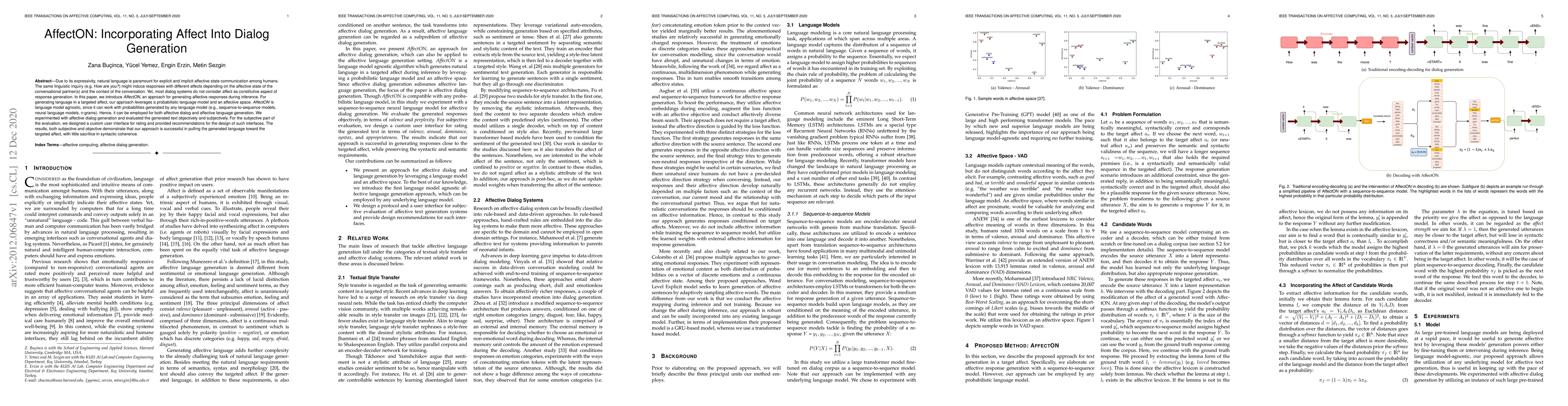 The paper introduces AffectON, an approach for generating affective responses in dialogue systems by incorporating targeted emotional expressions into language generation. The method leverages a probabilistic language model and an affective space, demonstrating successful affective response generation with minimal loss in syntactic coherence through both objective and subjective evaluations.