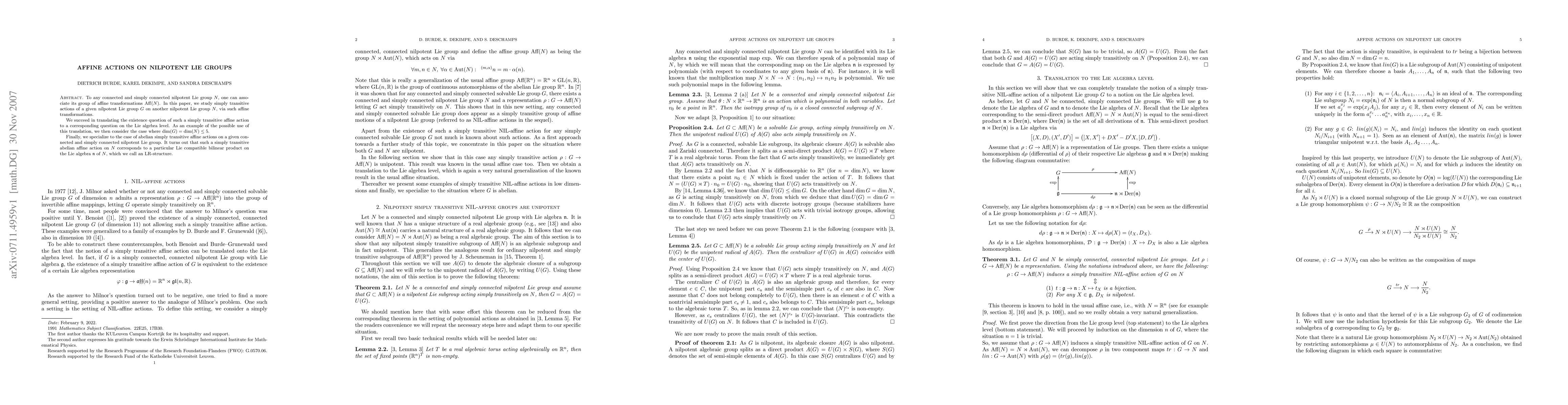 This paper investigates simply transitive affine actions of a nilpotent Lie group G on another nilpotent Lie group N, linking such actions to questions at the Lie algebra level. Specifically, it finds that abelian simply transitive affine actions correspond to a special Lie-compatible bilinear product on N's Lie algebra termed an LR-structure.