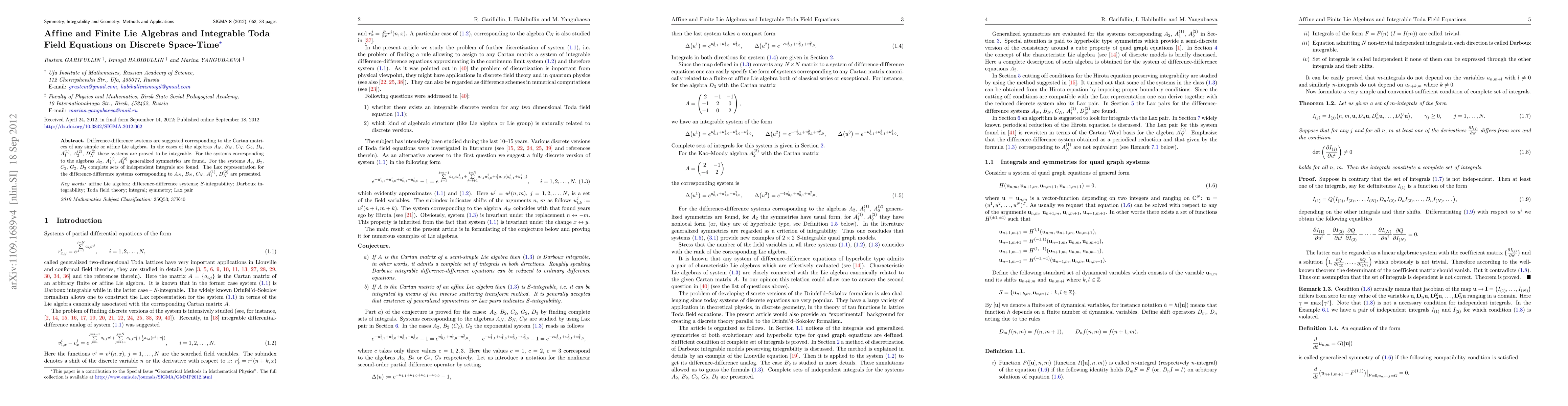 Difference-difference systems are suggested corresponding to the Cartan matrices of any simple or affine Lie algebra. In the cases of the algebras $A_N$, $B_N$, $C_N$, $G_2$, $D_3$, $A_1^{(1)}$, $A_2^{(2)}$, $D^{(2)}_N$ these systems are proved to be integrable. For the systems corresponding to the algebras $A_2$, $A_1^{(1)}$, $A_2^{(2)}$ generalized symmetries are found. For the systems $A_2$, $B_2$, $C_2$, $G_2$, $D_3$ complete sets of independent integrals are found. The Lax representation for the difference-difference systems corresponding to $A_N$, $B_N$, $C_N$, $A^{(1)}_1$, $D^{(2)}_N$ are presented.