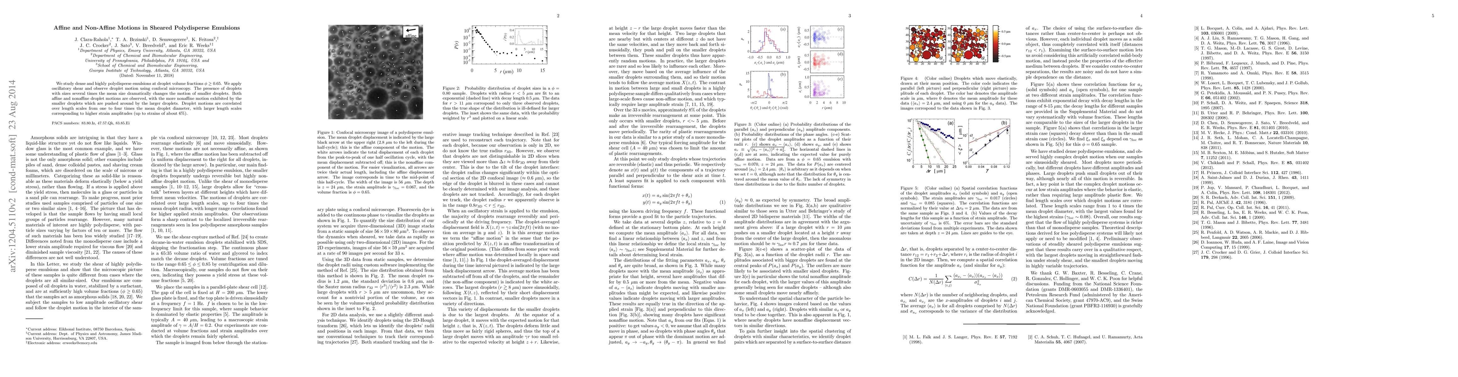 We study dense and highly polydisperse emulsions at droplet volume fractions \phi >= 0.65. We apply oscillatory shear and observe droplet motion using confocal microscopy. The presence of droplets with sizes several times the mean size dramatically changes the motion of smaller droplets. Both affine and nonaffine droplet motions are observed, with the more nonaffine motion exhibited by the smaller droplets which are pushed around by the larger droplets. Droplet motions are correlated over length scales from one to four times the mean droplet diameter, with larger length scales corresponding to higher strain amplitudes (up to strains of about 6%).