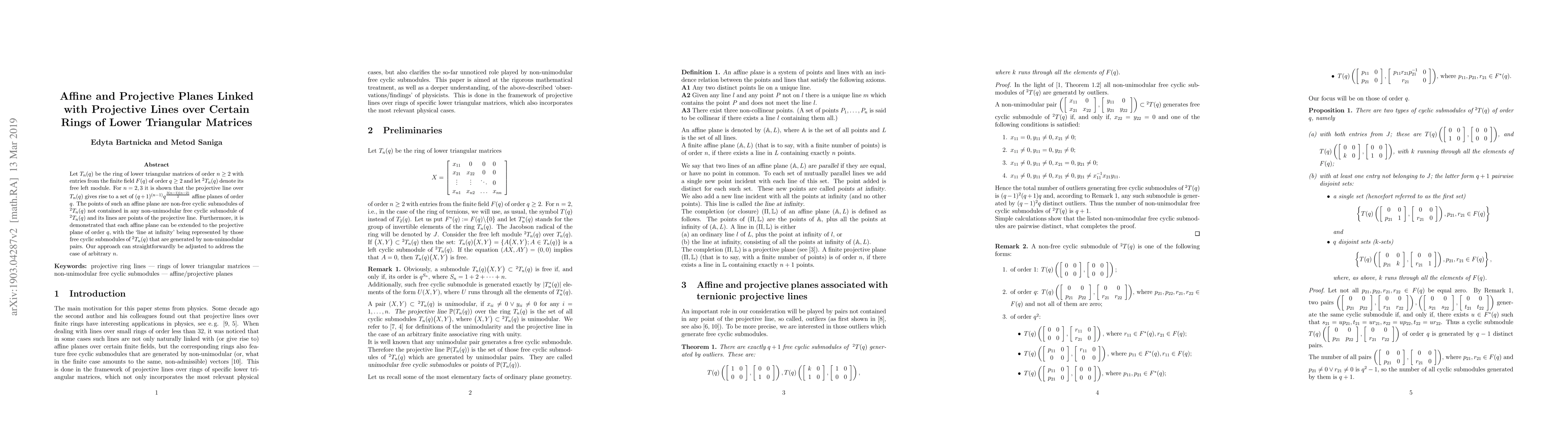 Let $T_n(q)$ be the ring of lower triangular matrices of order $n \geq 2$ with entries from the finite field $F(q)$ of order $q \geq 2$ and let ${^2T_n(q)}$ denote its free left module. For $n=2,3$ it is shown that the projective line over $T_n(q)$ gives rise to a set of $(q+1)^{(n-1)}q^{\frac{3(n-1)(n-2)}{2}}$ affine planes of order $q$. The points of such an affine plane are non-free cyclic submodules of ${^2T_n(q)}$ not contained in any non-unimodular free cyclic submodule of ${^2T_n(q)}$ and its lines are points of the projective line. Furthermore, it is demonstrated that each affine plane can be extended to the projective plane of order $q$, with the `line at infinity' being represented by those free cyclic submodules of ${^2T_n(q)}$ that are generated by non-unimodular pairs. Our approach can straightforwardly be adjusted to address the case of arbitrary $n$.