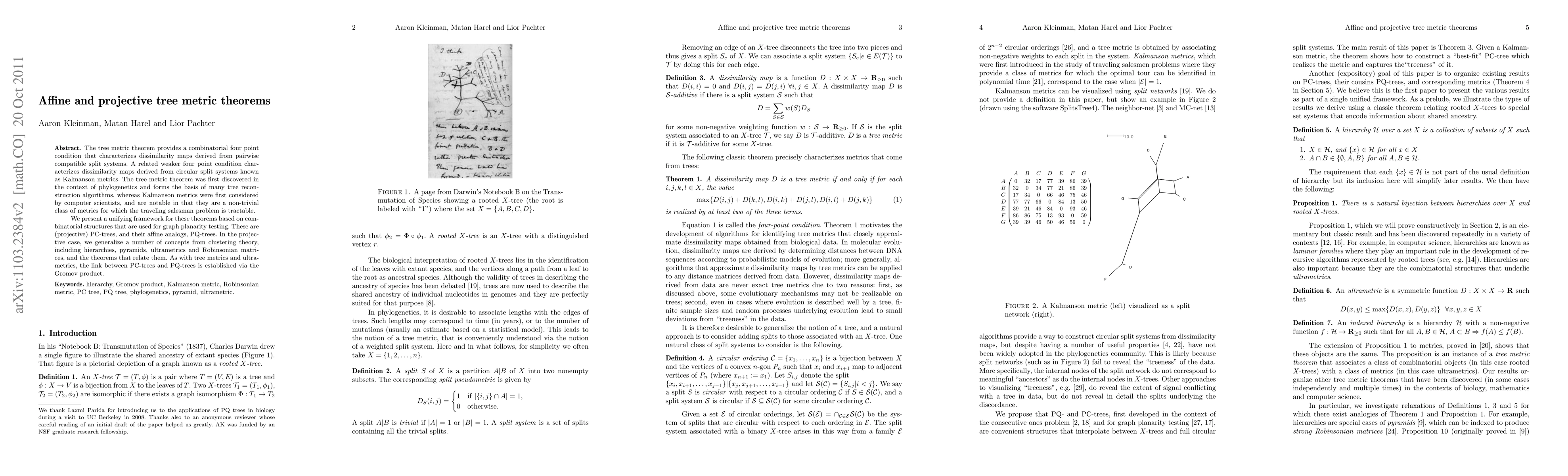 The tree metric theorem provides a combinatorial four point condition that characterizes dissimilarity maps derived from pairwise compatible split systems. A similar (but weaker) four point condition characterizes dissimilarity maps derived from circular split systems (Kalmanson metrics). The tree metric theorem was first discovered in the context of phylogenetics and forms the basis of many tree reconstruction algorithms, whereas Kalmanson metrics were first considered by computer scientists, and are notable in that they are a non-trivial class of metrics for which the traveling salesman problem is tractable. We present a unifying framework for these theorems based on combinatorial structures that are used for graph planarity testing. These are (projective) PC-trees, and their affine analogs, PQ-trees. In the projective case, we generalize a number of concepts from clustering theory, including hierarchies, pyramids, ultrametrics and Robinsonian matrices, and the theorems that relate them. As with tree metrics and ultrametrics, the link between PC-trees and PQ-trees is established via the Gromov product.