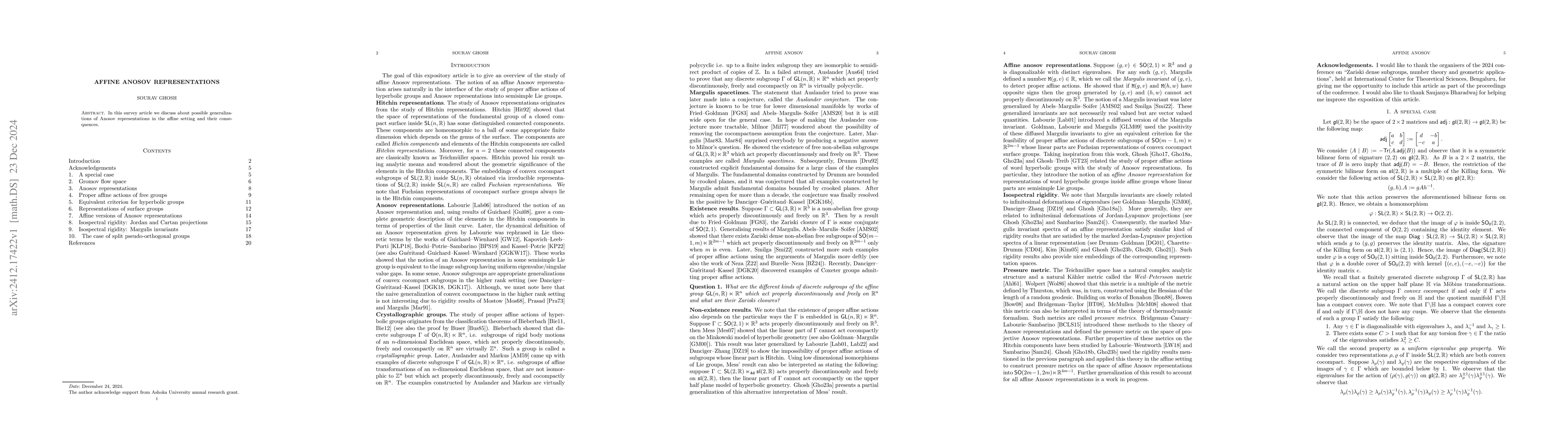 Summary: This survey explores extensions of Anosov representations into the affine framework, highlighting potential generalizations and their implications.