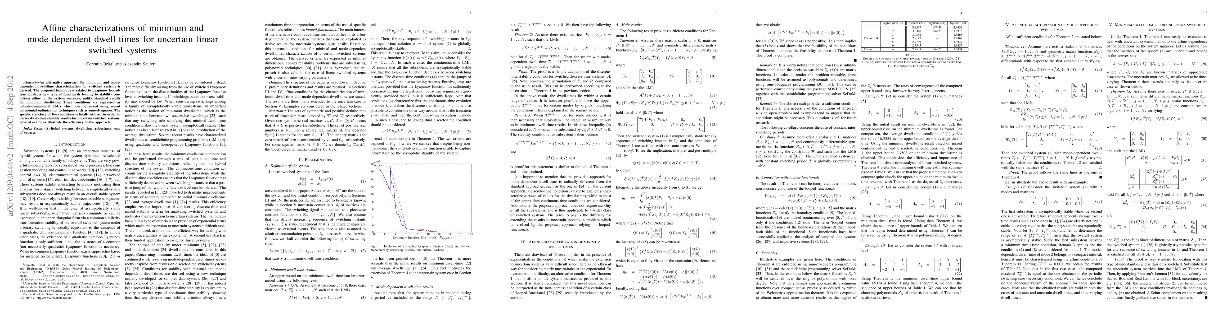 The research proposes an alternative approach for minimum and mode-dependent dwell-time characterization of switched systems using Lyapunov looped-functionals, leading to stability conditions affine in system matrices, contrasting with traditional results that are not.