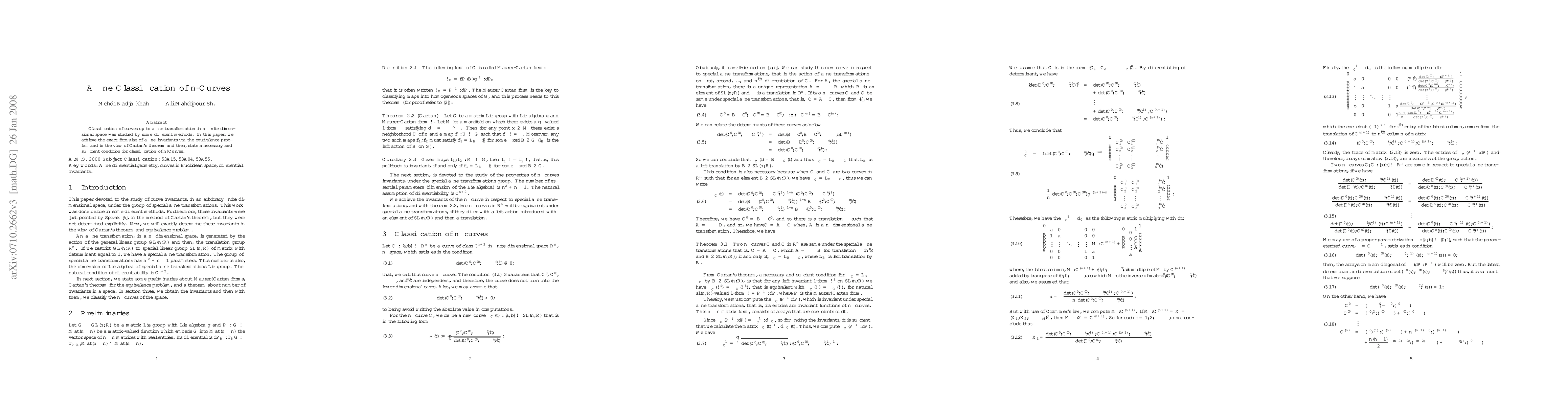 Classification of curves up to affine transformation in a finite dimensional space was studied by some different methods. In this paper, we achieve the exact formulas of affine invariants via the equivalence problem and in the view of Cartan's lemma and then, state a necessary and sufficient condition for classification of n--Curves.