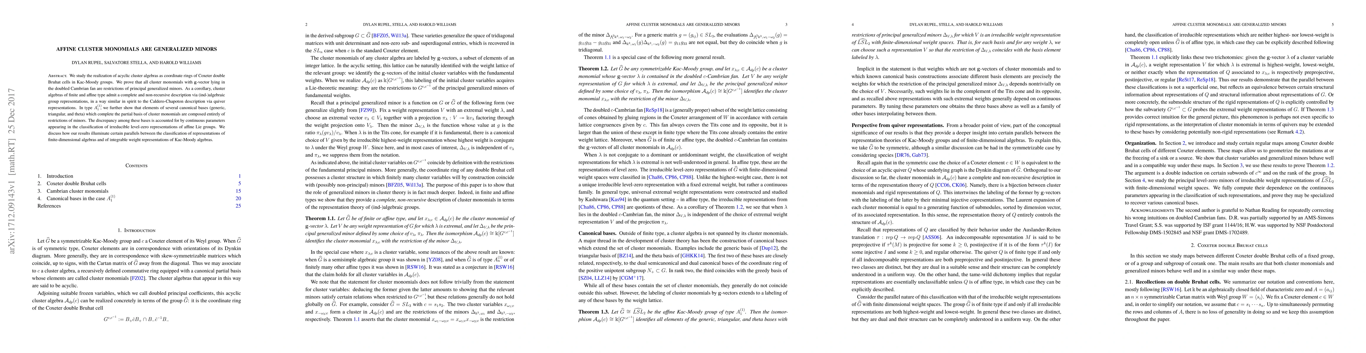 The paper establishes that affine cluster monomials correspond to generalized minors, providing a complete description of cluster algebras in terms of algebraic group representations. This extends to canonical bases in type A_1^{(1)}, highlighting parallels in representation classification between finite-dimensional and Kac-Moody algebras.