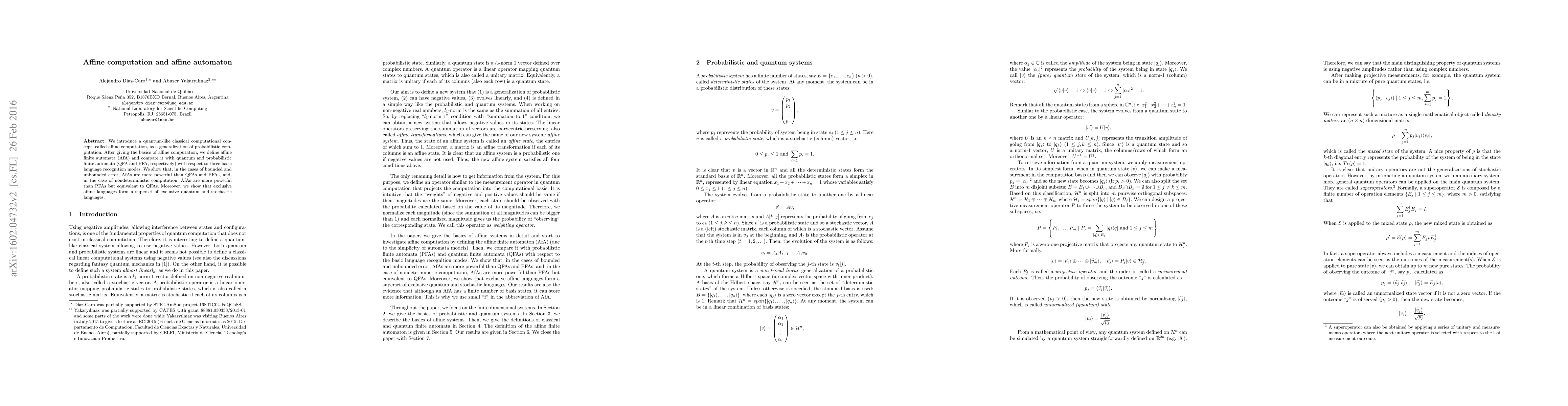We introduce a quantum-like classical computational model, called affine computation, as a generalization of probabilistic computation. After giving the basics of affine computation, we define affine finite automata (AfA) and compare it with quantum and probabilistic finite automata (QFA and PFA, respectively) with respect to three basic language recognition modes. We show that, in the cases of bounded and unbounded error, AfAs are more powerful than QFAs and PFAs, and, in the case of nondeterministic computation, AfAs are more powerful than PFAs but equivalent to QFAs.
