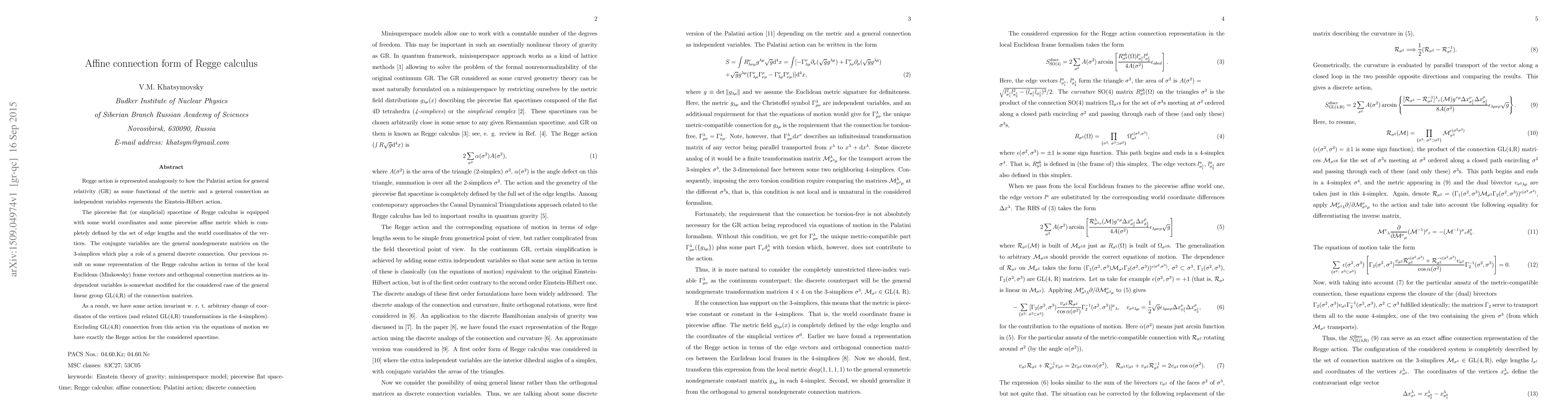 This paper presents a representation of Regge calculus using the affine connection form analogous to the Palatini action in general relativity, defining a piecewise flat spacetime through edge lengths and vertex coordinates. The Regge action is derived from the general linear group GL(4,R) connection matrices, resulting in an action invariant under vertex coordinate changes.