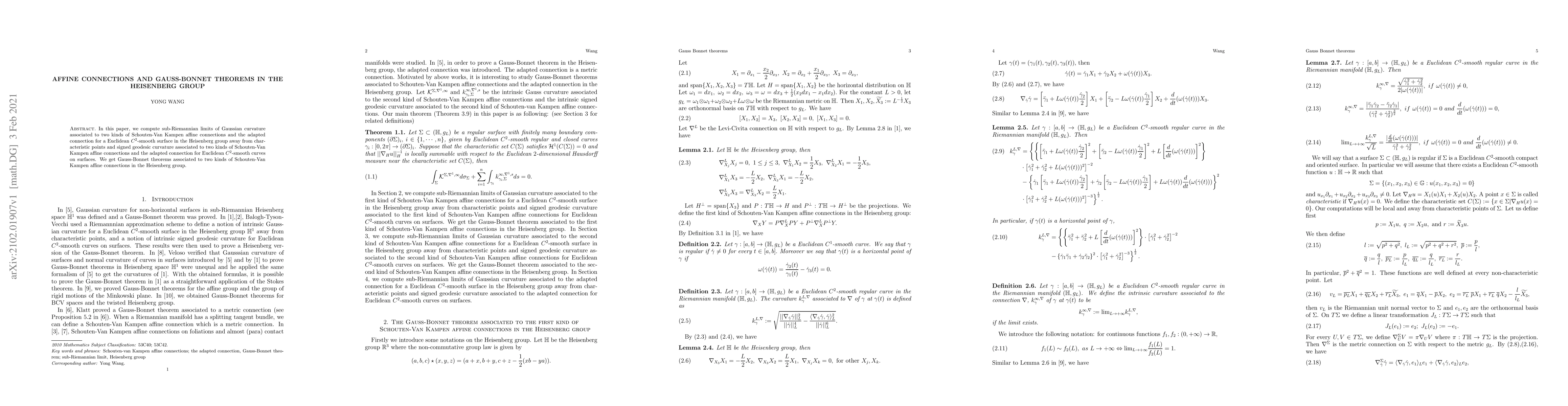 This paper computes sub-Riemannian limits of Gaussian curvature and signed geodesic curvature for affine connections in the Heisenberg group, deriving Gauss-Bonnet theorems for two types of Schouten-Van Kampen affine connections.