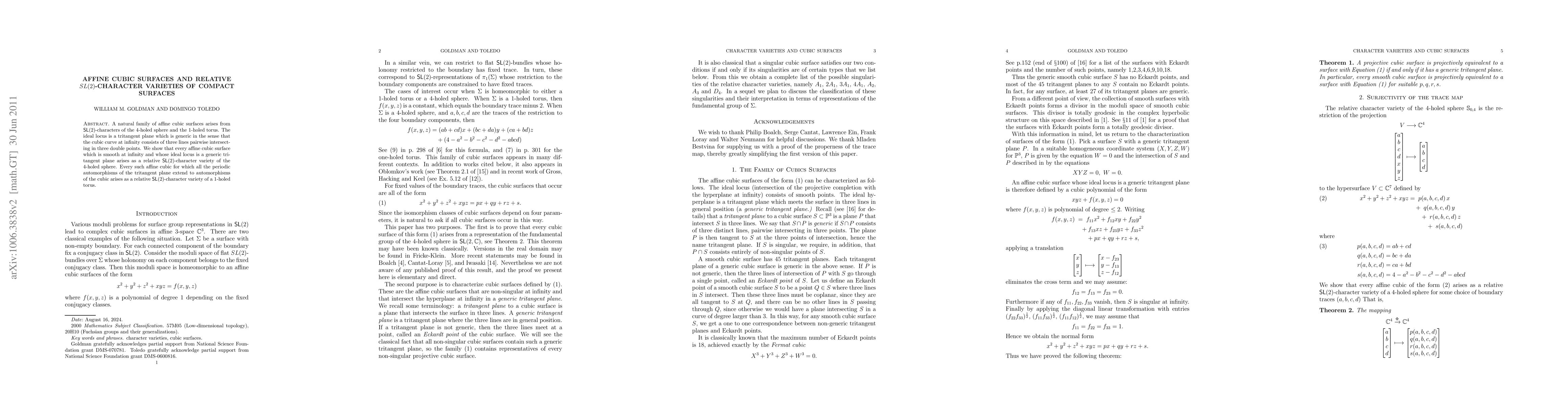 A natural family of affine cubic surfaces arises from SL(2)-characters of the 4-holed sphere and the 1-holed torus. The ideal locus is a tritangent plane which is generic in the sense that the cubic curve at infinity consists of three lines pairwise intersecting in three double points. We show that every affine cubic surface which is smooth at infinity and whose ideal locus is a generic tritangent plane arises as a relative SL(2)-character variety of the 4-holed sphere. Every such affine cubic for which all the periodic automorphisms of the tritangent plane extend to automorphisms of the cubic arises as a relative SL(2)-character variety of a 1-holed torus.
