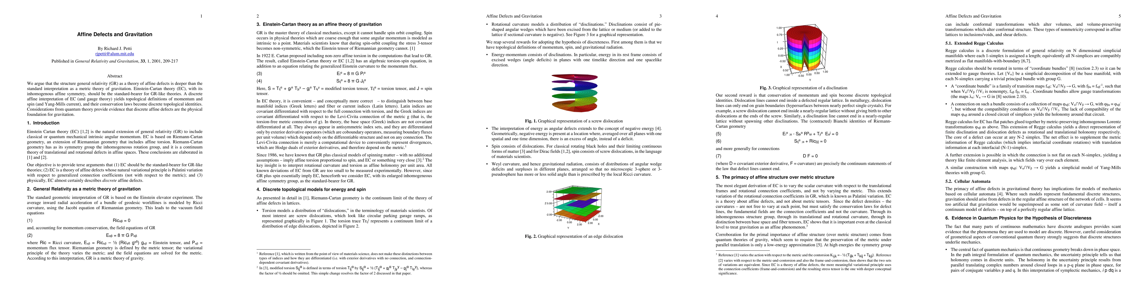 We argue that the structure general relativity (GR) as a theory of affine defects is deeper than the standard interpretation as a metric theory of gravitation. Einstein-Cartan theory (EC), with its inhomogenous affine symmetry, should be the standard-bearer for GR-like theories. A discrete affine interpretation of EC (and gauge theory) yields topological definitions of momentum and spin (and Yang Mills current), and their conservation laws become discrete topological identities. Considerations from quantum theory provide evidence that discrete affine defects are the physical foundation for gravitation.