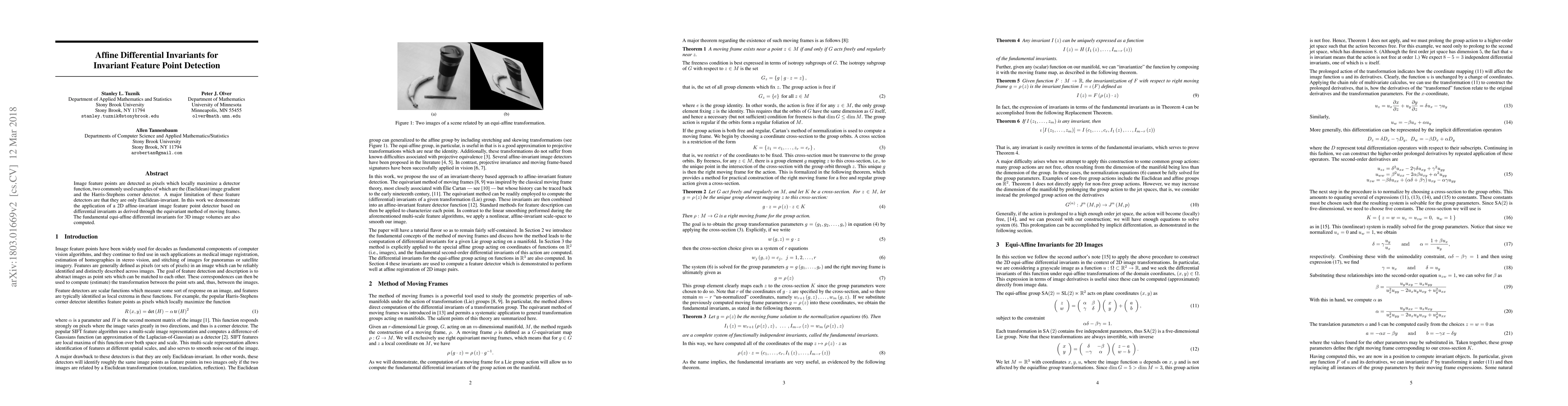 This paper introduces an affine-invariant feature point detector based on differential invariants derived via the equivariant method of moving frames, addressing the Euclidean-invariance limitation of existing detectors like the Harris-Stephens corner detector. It also computes fundamental equi-affine differential invariants for 3D image volumes.