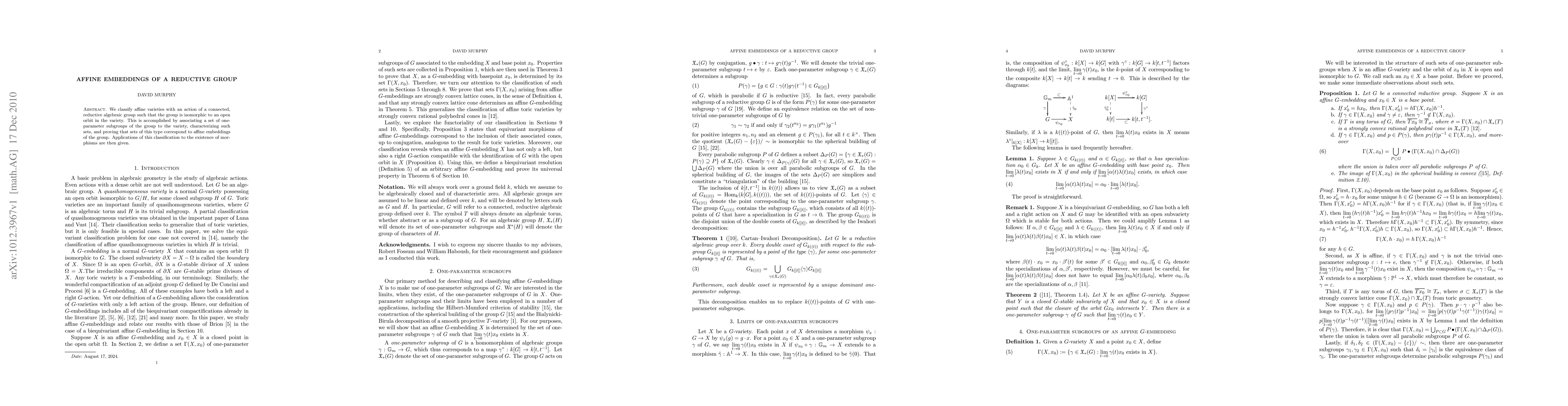 We classify affine varieties with an action of a connected, reductive algebraic group such that the group is isomorphic to an open orbit in the variety. This is accomplished by associating a set of one-parameter subgroups of the group to the variety, characterizing such sets, and proving that sets of this type correspond to affine embeddings of the group. Applications of this classification to the existence of morphisms are then given.