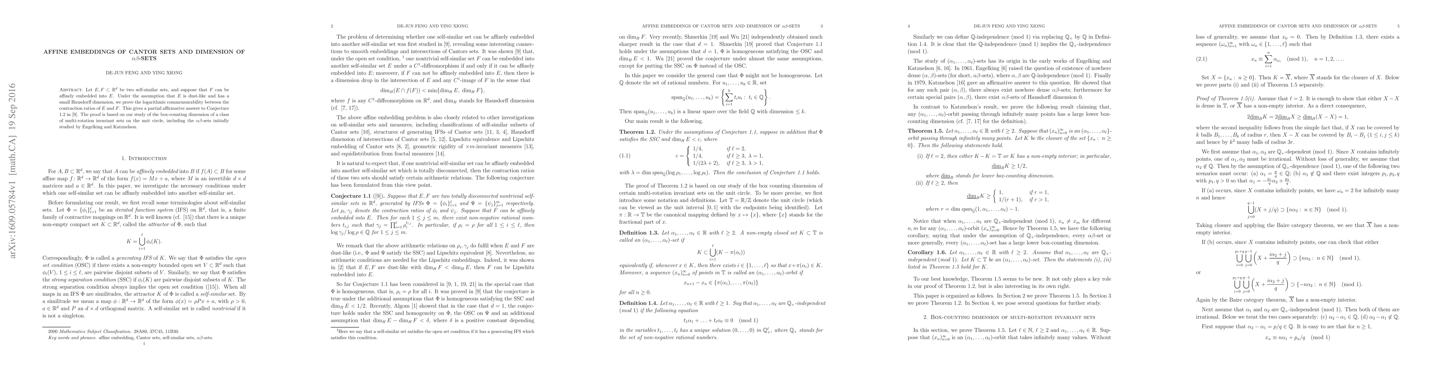 The paper employs techniques from fractal geometry and iterated function systems to study affine embeddings of Cantor sets and the dimension of $\alpha\beta$-sets, utilizing concepts from self-similarity, box-counting dimension, and Hausdorff dimension.