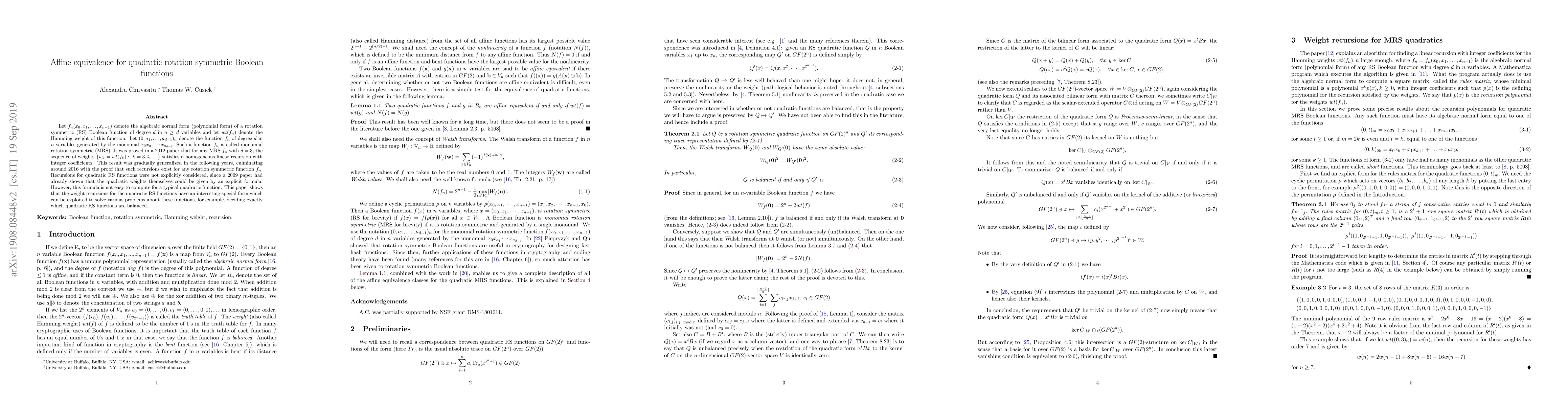 This paper explores affine equivalence for quadratic rotation symmetric Boolean functions, demonstrating that their weight recursions exhibit a special form. This insight facilitates solving problems such as determining which quadratic rotation symmetric functions are balanced.