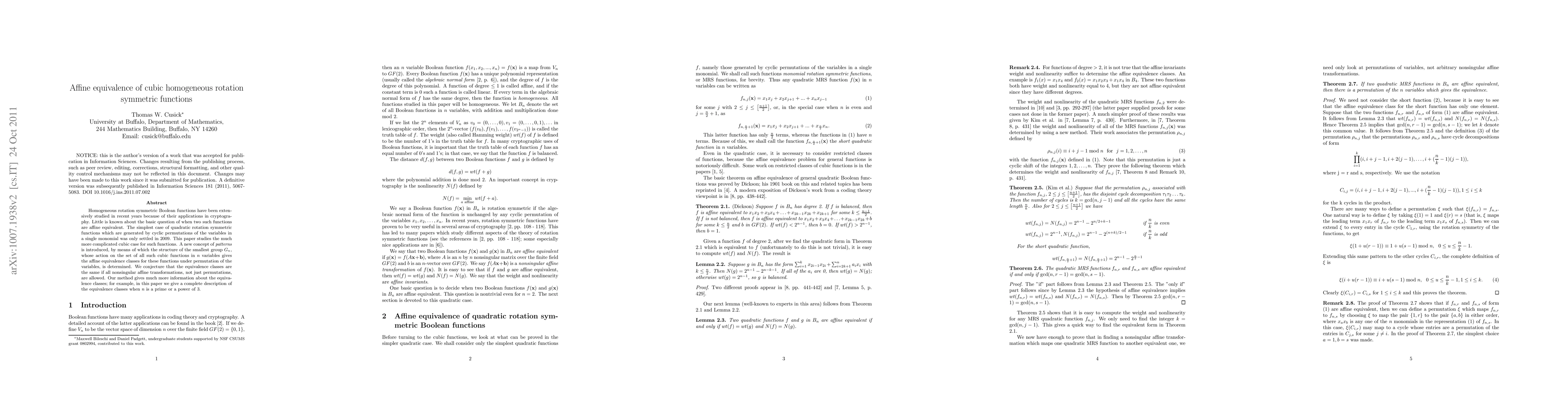 This paper investigates the affine equivalence of cubic homogeneous rotation symmetric Boolean functions, introducing a new concept of "patterns" to determine the structure of the smallest group G_n for these functions. The study verifies a conjecture about equivalence classes under nonsingular affine transformations for dimensions less than 22, and provides a complete description of equivalence classes when the number of variables is a prime or a power of 3.