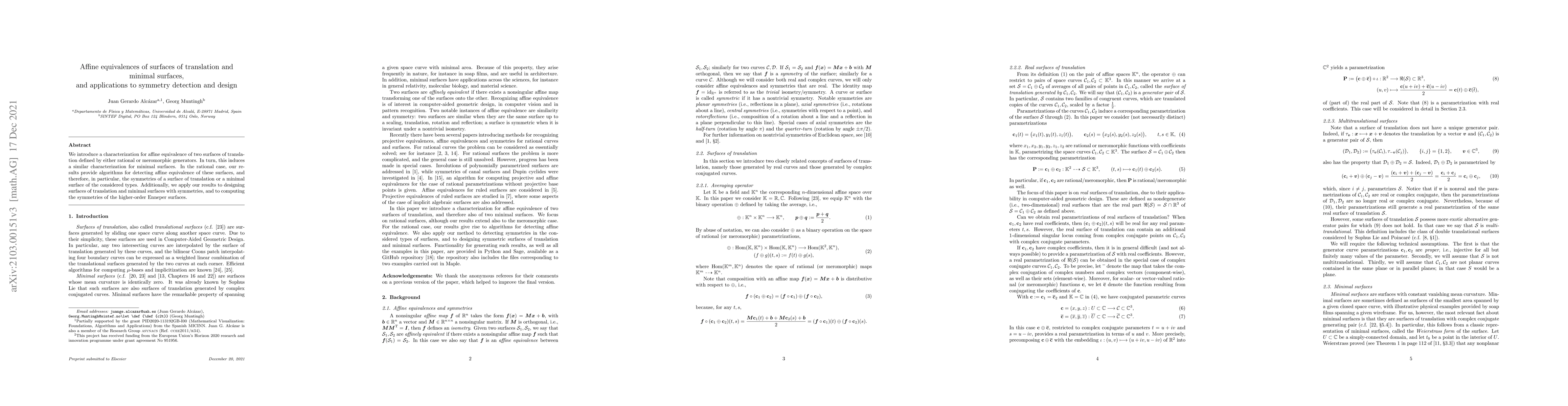 This paper characterizes affine equivalences for surfaces of translation and minimal surfaces, providing algorithms for detecting symmetries and designing surfaces with specific symmetries, including higher-order Enneper surfaces. The methodology applies to rational and meromorphic generators.