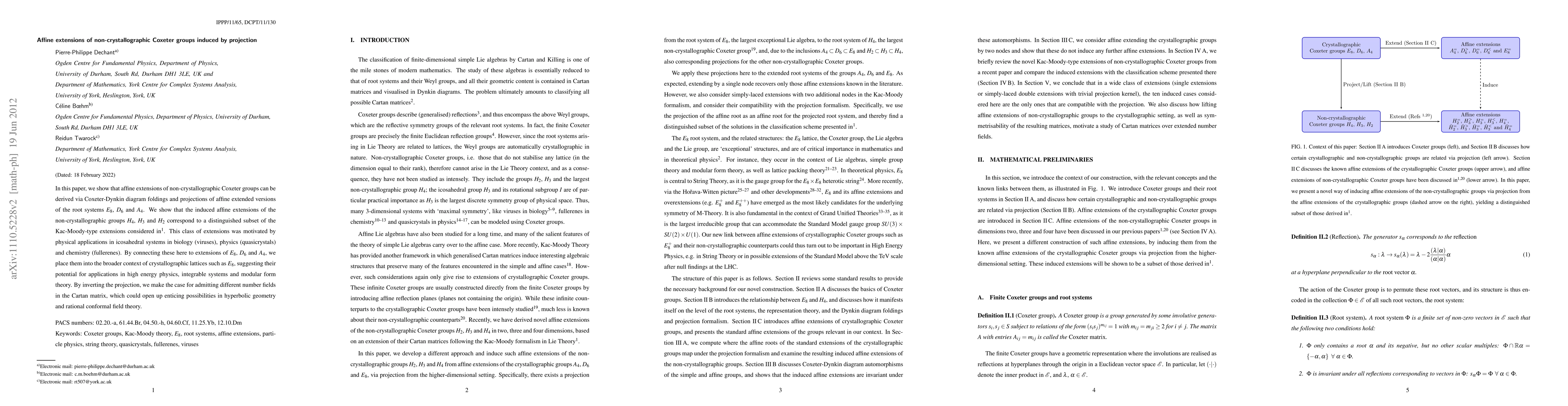 This paper demonstrates how affine extensions of non-crystallographic Coxeter groups arise from Coxeter-Dynkin diagram foldings and projections of extended root systems E_8, D_6, and A_4, linking these extensions to applications in high energy physics, integrable systems, and modular form theory. The study also explores the potential of diverse number fields in Cartan matrices for hyperbolic geometry and rational conformal field theory.
