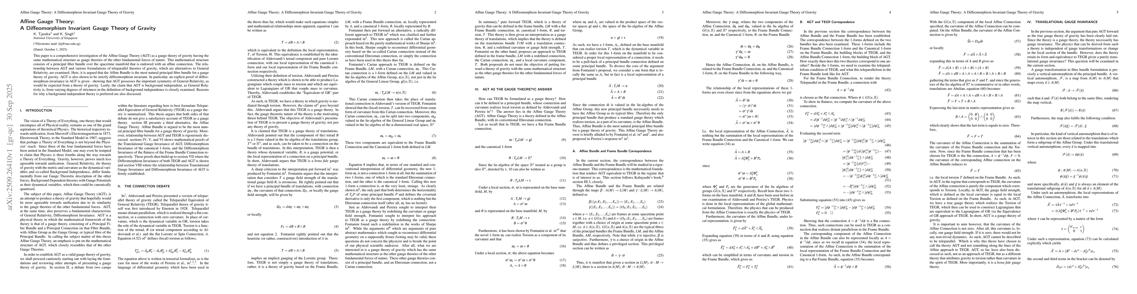 The work rigorously proves the diffeomorphism invariance of the canonical 1-form and the flatness of the Frame Bundle connection under arbitrary diffeomorphisms, while establishing the explicit translational gauge invariance of AGT through transformation laws.