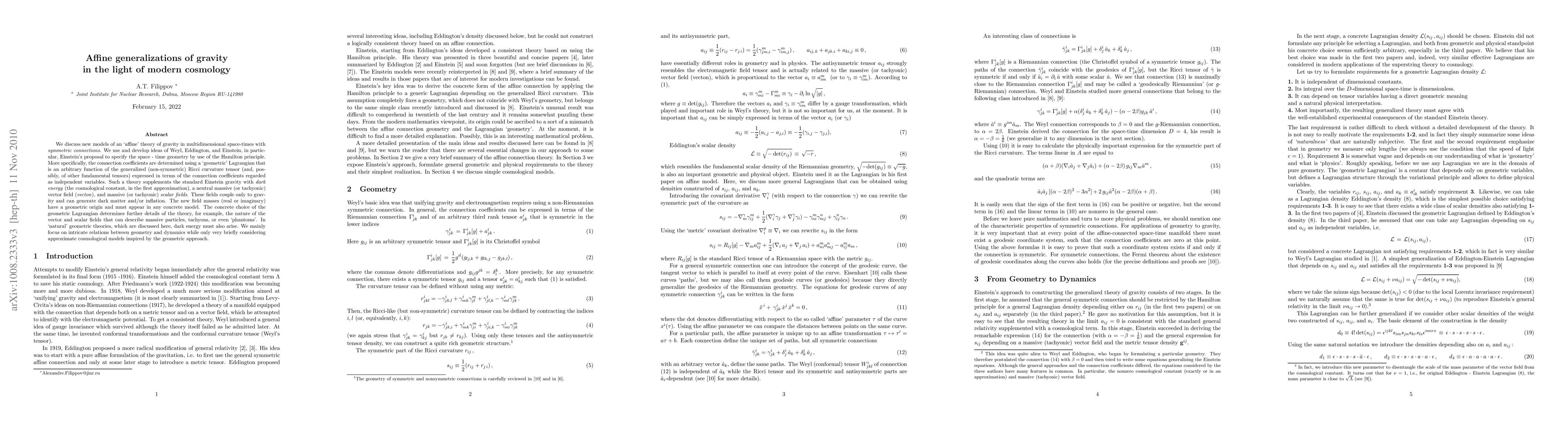 We discuss new models of an `affine' theory of gravity in multidimensional space-times with symmetric connections. We use and develop ideas of Weyl, Eddington, and Einstein, in particular, Einstein's proposal to specify the space - time geometry by use of the Hamilton principle. More specifically, the connection coefficients are determined using a `geometric' Lagrangian that is an arbitrary function of the generalized (non-symmetric) Ricci curvature tensor (and, possibly, of other fundamental tensors) expressed in terms of the connection coefficients regarded as independent variables. Such a theory supplements the standard Einstein gravity with dark energy (the cosmological constant, in the first approximation), a neutral massive (or tachyonic) vector field (vecton), and massive (or tachyonic) scalar fields. These fields couple only to gravity and can generate dark matter and/or inflation. The new field masses (real or imaginary) have a geometric origin and must appear in any concrete model. The concrete choice of the geometric Lagrangian determines further details of the theory, for example, the nature of the vector and scalar fields that can describe massive particles, tachyons, or even `phantoms'. In `natural' geometric theories, which are discussed here, dark energy must also arise. We mainly focus on intricate relations between geometry and dynamics while only very briefly considering approximate cosmological models inspired by the geometric approach.