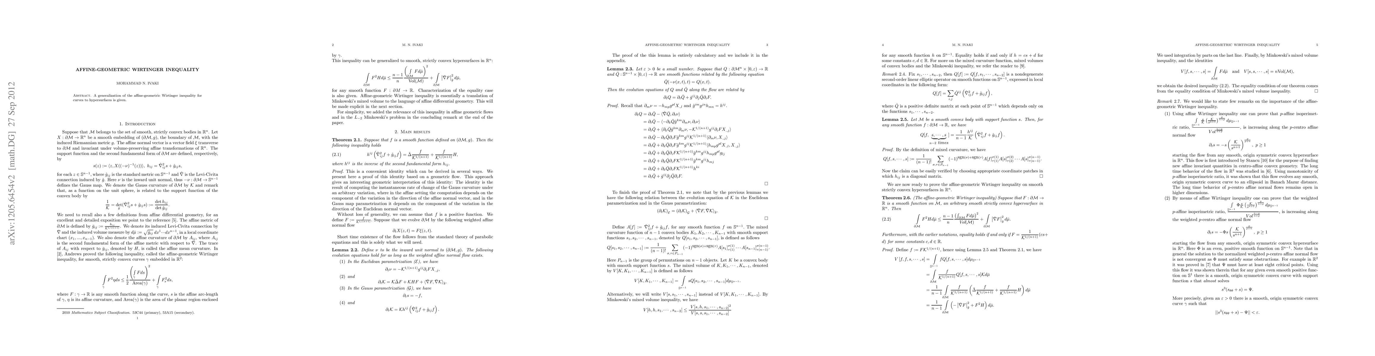 Summary: This paper generalizes the affine-geometric Wirtinger inequality, originally formulated for curves, to apply to hypersurfaces, providing a new mathematical framework for analyzing geometric properties.