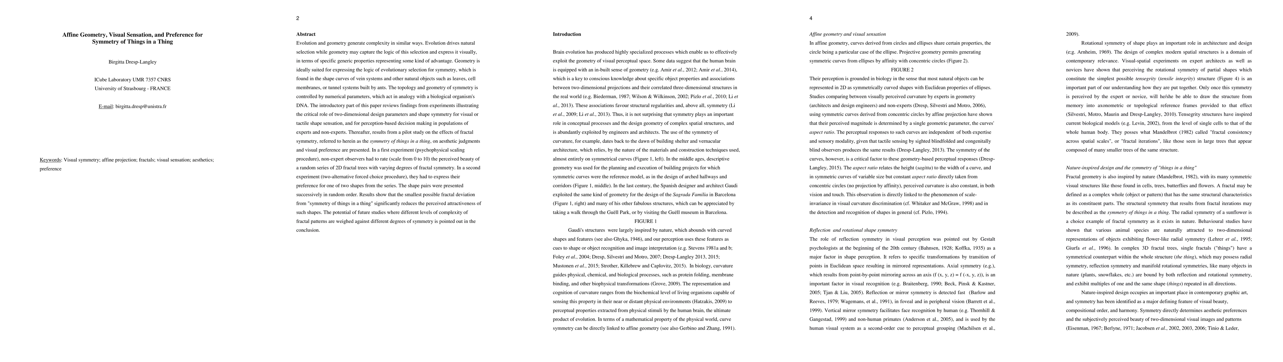 Evolution and geometry generate complexity in similar ways. Evolution drives natural selection while geometry may capture the logic of this selection and express it visually, in terms of specific generic properties representing some kind of advantage. Geometry is ideally suited for expressing the logic of evolutionary selection for symmetry, which is found in the shape curves of vein systems and other natural objects such as leaves, cell membranes, or tunnel systems built by ants. The topology and geometry of symmetry is controlled by numerical parameters, which act in analogy with a biological organism's DNA. The introductory part of this paper reviews findings from experiments illustrating the critical role of two-dimensional design parameters and shape symmetry for visual or tactile shape sensation, and for perception-based decision making in populations of experts and non-experts. Thereafter, results from a pilot study on the effects of fractal symmetry, referred to herein as the symmetry of things in a thing, on aesthetic judgments and visual preference are presented. In a first experiment (psychophysical scaling procedure), non-expert observers had to rate (scale from 0 to 10) the perceived attractiveness of a random series of 2D fractal trees with varying degrees of fractal symmetry. In a second experiment (two-alternative forced choice procedure), they had to express their preference for one of two shapes from the series. The shape pairs were presented successively in random order. Results show that the smallest possible fractal deviation from "symmetry of things in a thing" significantly reduces the perceived attractiveness of such shapes. The potential of future studies where different levels of complexity of fractal patterns are weighed against different degrees of symmetry is pointed out in the conclusion.