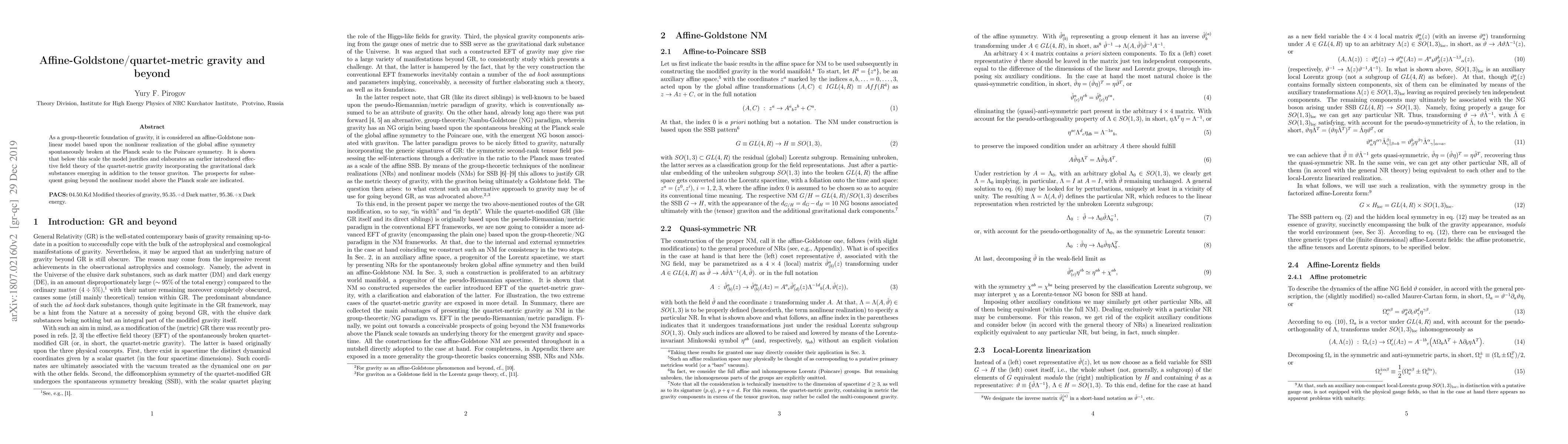As a group-theoretic foundation of gravity, it is considered an affine-Goldstone nonlinear model based upon the nonlinear realization of the global affine symmetry spontaneously broken at the Planck scale to the Poincare symmetry. It is shown that below this scale the model justifies and elaborates an earlier introduced effective field theory of the quartet-metric gravity incorporating the gravitational dark substances emerging in addition to the tensor graviton. The prospects for subsequent going beyond the nonlinear model above the Planck scale are indicated.