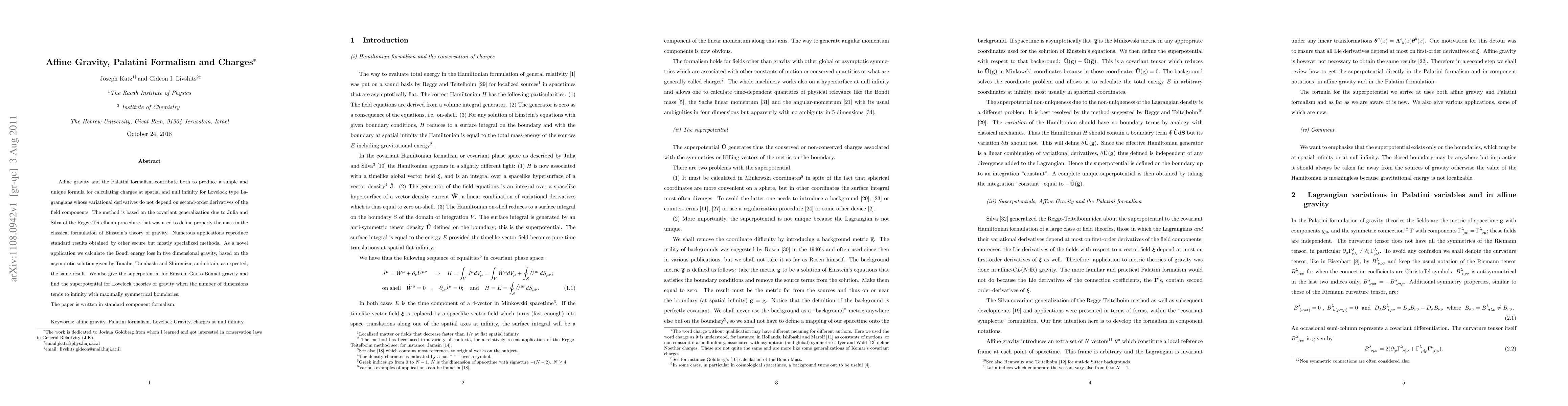 Affine gravity and the Palatini formalism contribute both to produce a simple and unique formula for calculating charges at spatial and null infinity for Lovelock type Lagrangians whose variational derivatives do not depend on second-order derivatives of the field components. The method is based on the covariant generalization due to Julia and Silva of the Regge-Teitelboim procedure that was used to define properly the mass in the classical formulation of Einstein's theory of gravity. Numerous applications reproduce standard results obtained by other secure but mostly specialized methods. As a novel application we calculate the Bondi energy loss in five dimensional gravity, based on the asymptotic solution given by Tanabe, Tanahashi and Shiromizu, and obtain, as expected, the same result. We also give the superpotential for Einstein-Gauss-Bonnet gravity and find the superpotential for Lovelock theories of gravity when the number of dimensions tends to infinity with maximally symmetrical boundaries. The paper is written in standard component formalism.