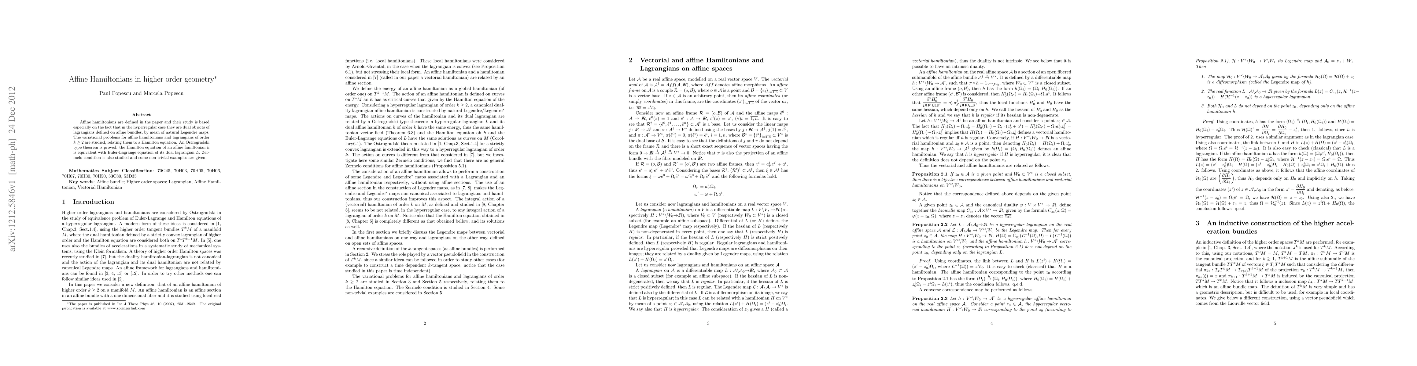 Researchers study affine Hamiltonians in higher order geometry, proving an Ostrogradski type theorem equating their Hamilton equations to Euler-Lagrange equations of dual lagrangians.
