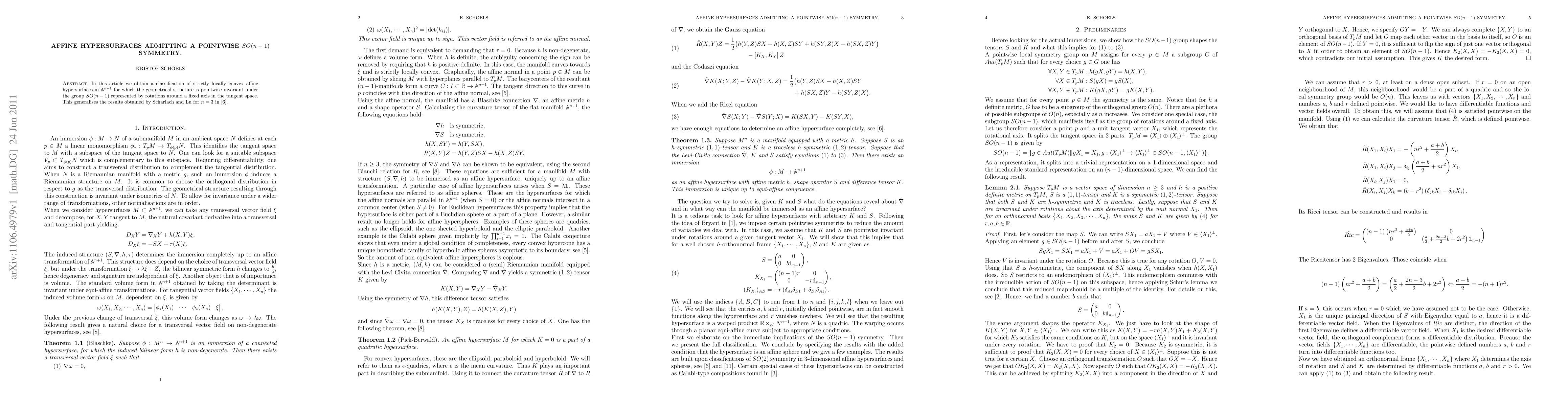 Summary: The paper classifies strictly locally convex affine hypersurfaces in \( \mathbb{A}^{n+1} \) that exhibit pointwise symmetry under rotations around a fixed axis, represented by the group \( \text{SO}(n-1) \). The focus is on the geometrical invariance of these hypersurfaces.