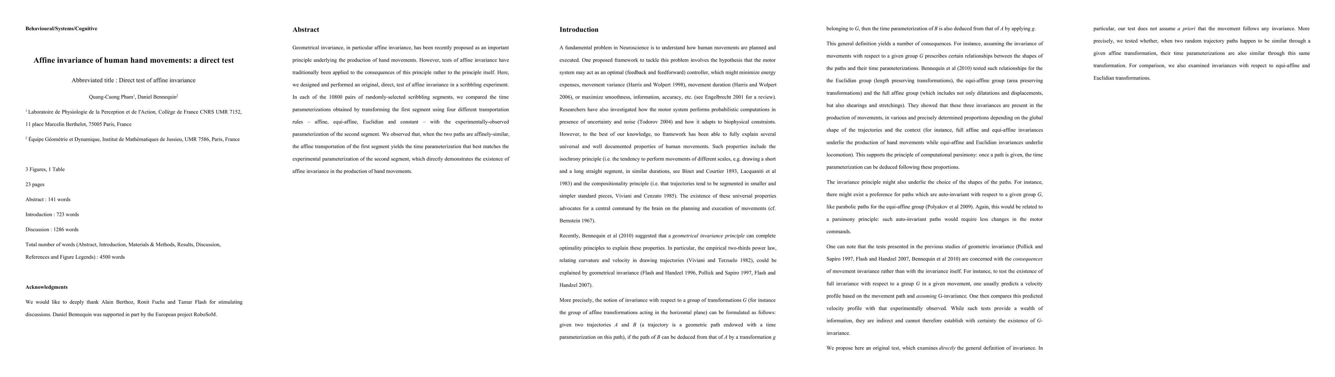 Geometrical invariance, in particular affine invariance, has been recently proposed as an important principle underlying the production of hand movements. However, tests of affine invariance have traditionally been applied to the consequences of this principle rather to the principle itself. Here, we designed and performed an original, direct, test of affine invariance in a scribbling experiment. In each of the 10800 pairs of randomly-selected scribbling segments, we compared the time parameterizations obtained by transforming the first segment using four different transportation rules - affine, equi-affine, Euclidian and constant - with the experimentally-observed parameterization of the second segment. We observed that, when the two paths are affinely-similar, the affine transportation of the first segment yields the time parameterization that best matches the experimental parameterization of the second segment, which directly demonstrates the existence of affine invariance in the production of hand movements.