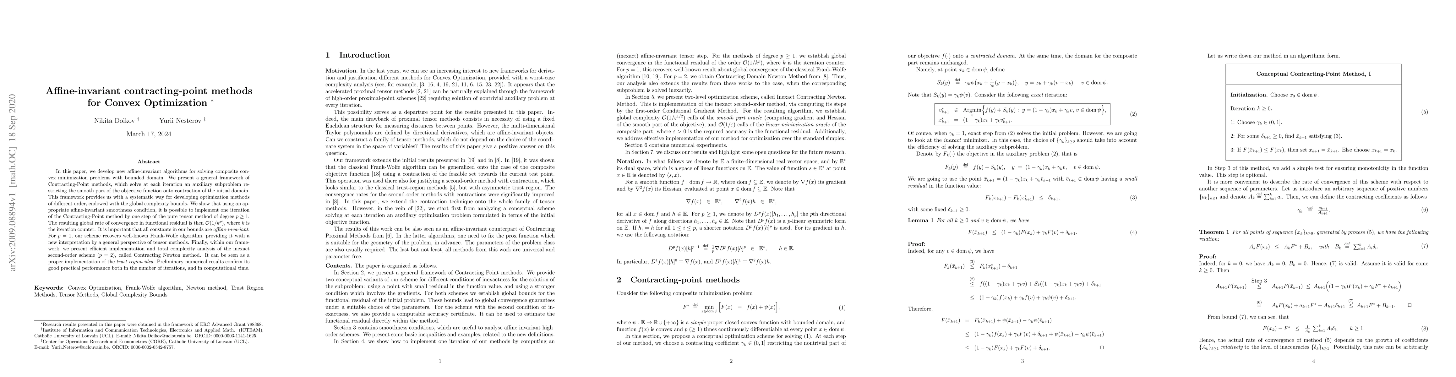 In this paper, we develop new affine-invariant algorithms for solving composite convex minimization problems with bounded domain. We present a general framework of Contracting-Point methods, which solve at each iteration an auxiliary subproblem restricting the smooth part of the objective function onto contraction of the initial domain. This framework provides us with a systematic way for developing optimization methods of different order, endowed with the global complexity bounds. We show that using an appropriate affine-invariant smoothness condition, it is possible to implement one iteration of the Contracting-Point method by one step of the pure tensor method of degree $p \geq 1$. The resulting global rate of convergence in functional residual is then ${\cal O}(1 / k^p)$, where $k$ is the iteration counter. It is important that all constants in our bounds are affine-invariant. For $p = 1$, our scheme recovers well-known Frank-Wolfe algorithm, providing it with a new interpretation by a general perspective of tensor methods. Finally, within our framework, we present efficient implementation and total complexity analysis of the inexact second-order scheme $(p = 2)$, called Contracting Newton method. It can be seen as a proper implementation of the trust-region idea. Preliminary numerical results confirm its good practical performance both in the number of iterations, and in computational time.