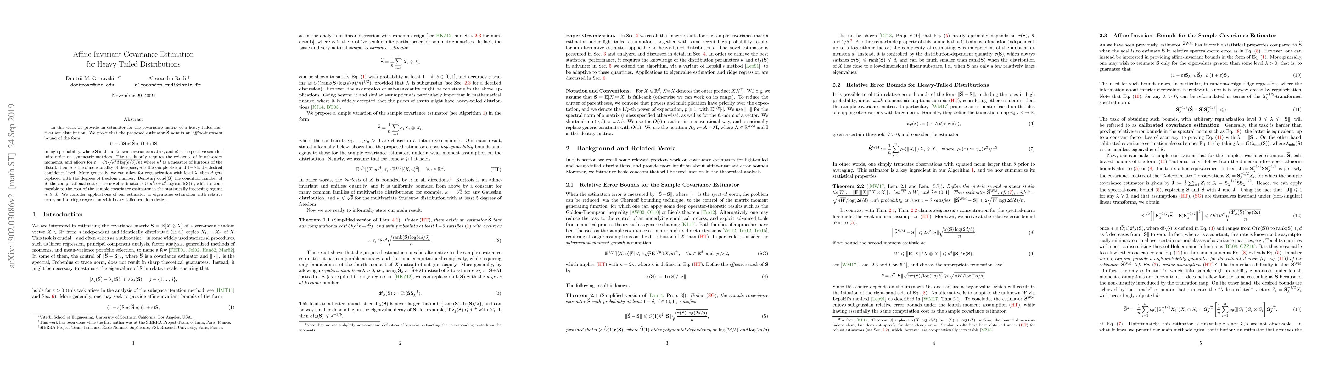 This paper proposes an affine-invariant covariance matrix estimator for heavy-tailed distributions, proving it bounds the true covariance matrix with high probability. The estimator's computational cost is comparable to the sample covariance estimator, and it is applied to eigenvalue estimation and ridge regression in heavy-tailed scenarios.